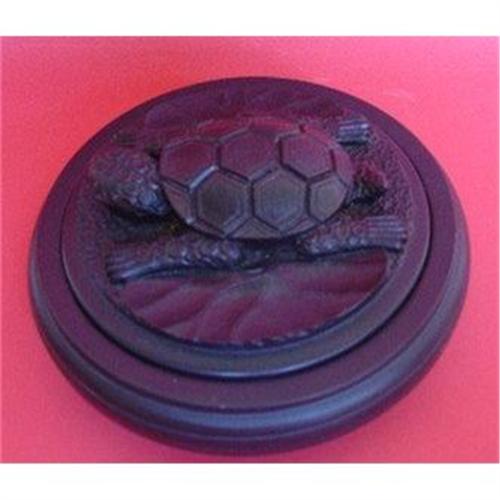 Black basalt box from Mexico. Black basalt is a type of rock that is both fine grained and dense. This carved stone box has a turtle lying a two lily pads on the lid. <p> Measurements: 5 3/4" in diameter, Height: Approximately 3" <p> Condition: Excellent
