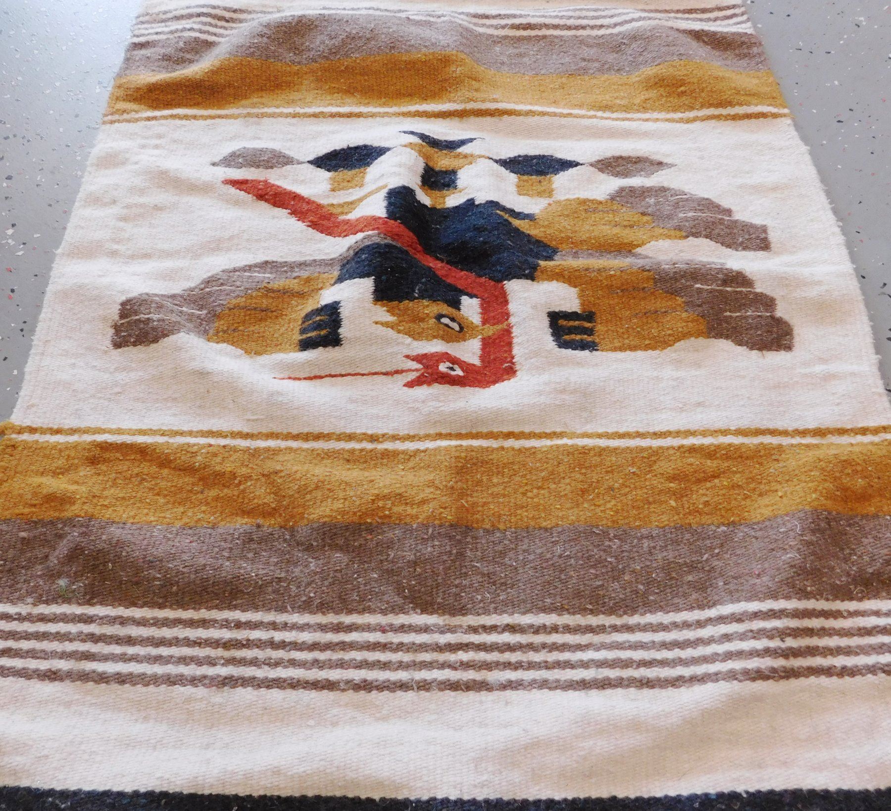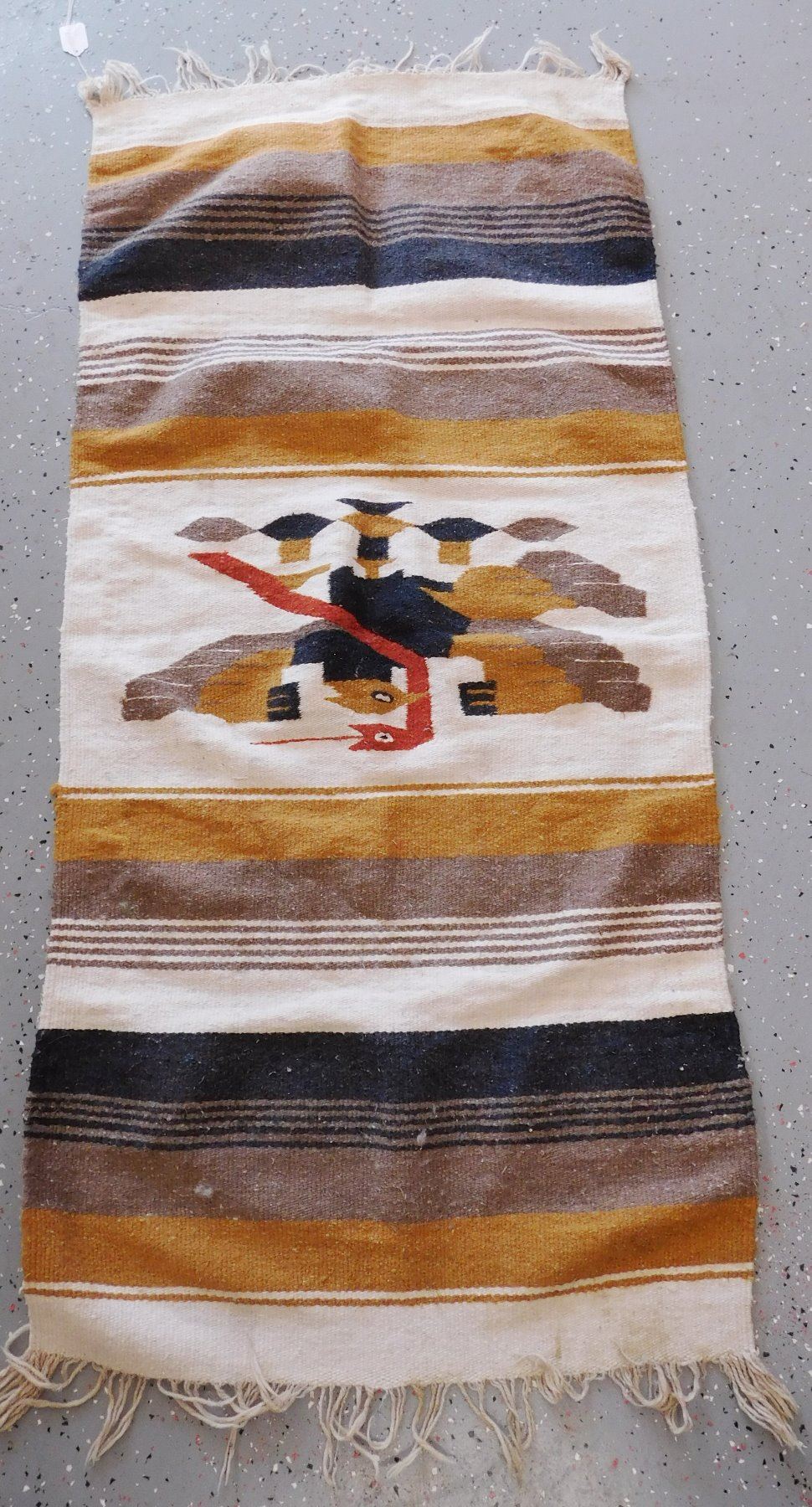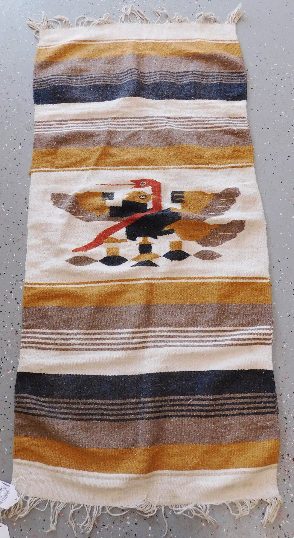 Mexican Blanket, circa 1970s. Made of wool and cotton, the item measures 23" x 53" w/fringe. Mexico. Classic Mexican motif, perched eagle with snake. Condition: Needs cleaning, see images. Shipping: $18.50 w/insurance and signature.