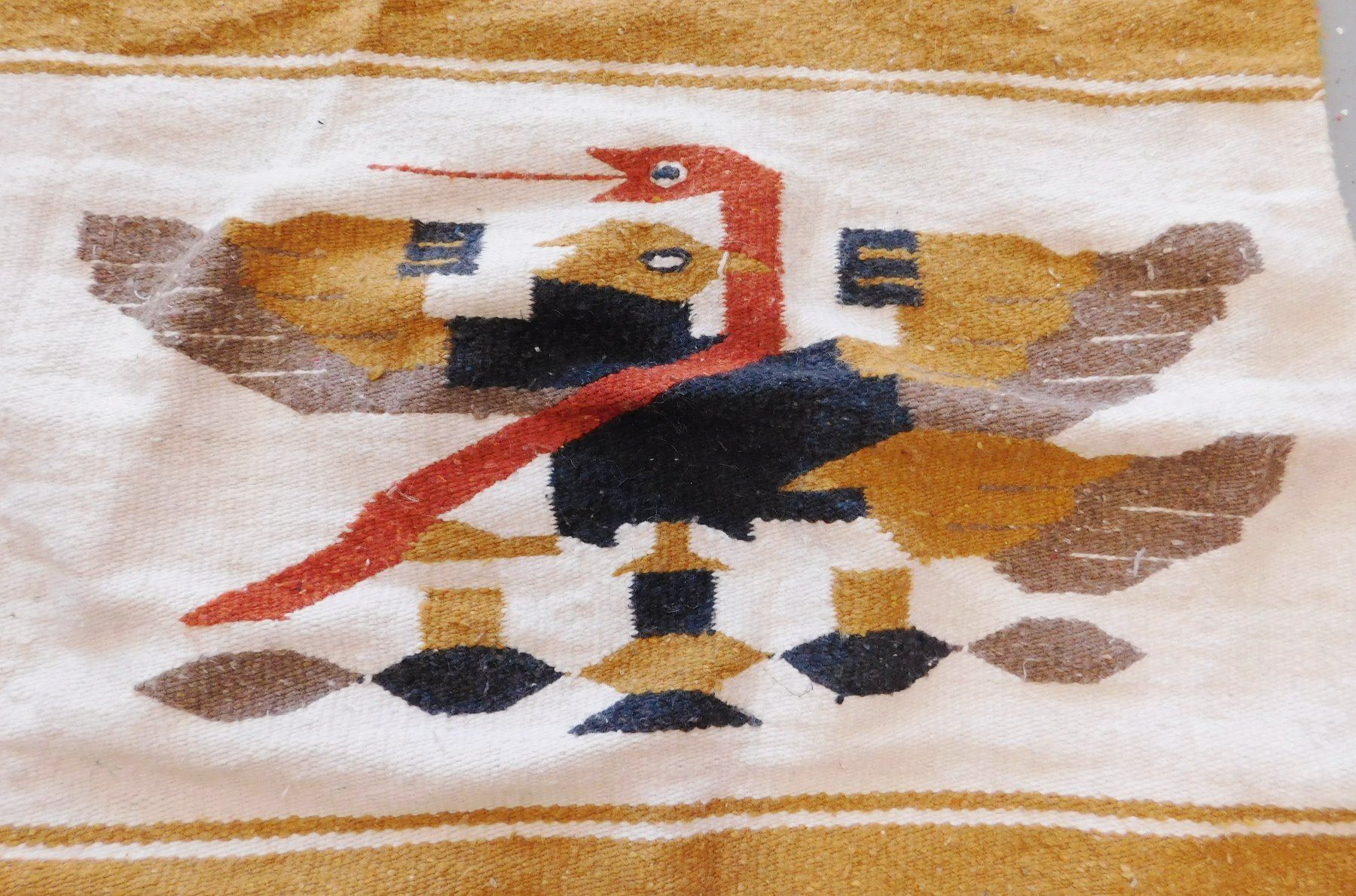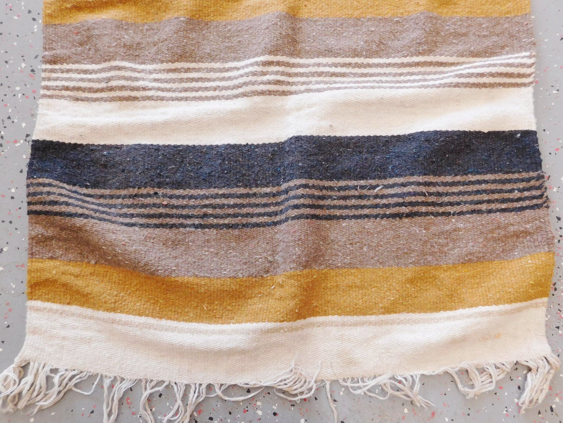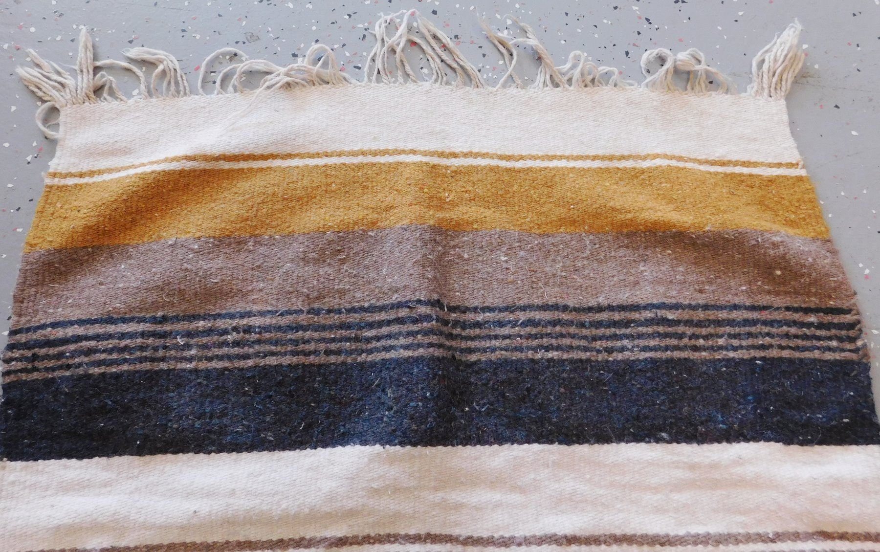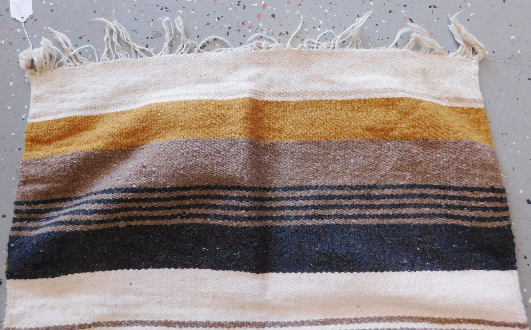 Mexican Blanket, circa 1970s. Made of wool and cotton, the item measures 23" x 53" w/fringe. Mexico. Classic Mexican motif, perched eagle with snake. Condition: Needs cleaning, see images. Shipping: $18.50 w/insurance and signature.