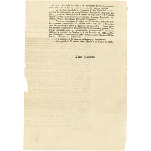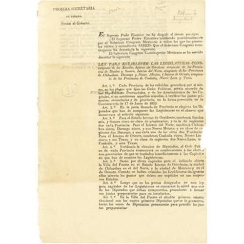 <B>[Broadside]: Original Issue of a</B></I> <B>Decree to Establish Constitutional Legislatures of the Three Newly Formed States. </B></I> Folio broadsheet printed on front and back, 7.75" x 11" inches. Mexico. Feb. 4, 1824<B>, s</B></I>igned in print at the end <B>by Juan Guzman</B></I>. This is the original issue of the decree listed as lot 56009, and is not in Streeter. [With heading:] Primera Secretaria de Estado. Seccion de Gobierno. In part: "<I>Law to establish the constituent legislatures of the states, internal Western Provinces composed of Sinaloa and Sonora, internal Northern Provinces composed of Chihuahua, Durango and New Mexico, and internal Eastern Provinces composed of Ccoahuila, Nuevo Leon and Texas. . .</B></I> " Dated "<I>Mexico 4 de Febeero [sic] de 1824</B></I>" at the end. Dark toning band across center, chipping long both margins, affecting a few lines of text. <I>from the collection of Darrel Brown.</B></I><BR><BR><b>Shipping:</b> Flat Material, Small (<a target="_blank" href="http://www.heritageauctions.com/common/shipping.php">view shipping information</a>)