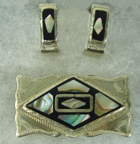 Ca. 1980s, Fine engraved silver dress buckle and two keepers all with inlaid tops. Very good condition. Buckle 1" x 2", keepers 7/8" x 3/8"