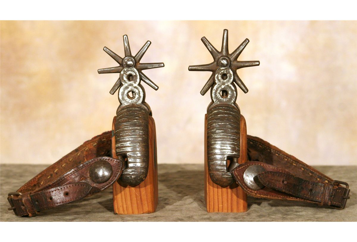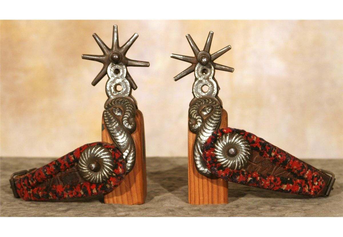 Mexican Chihuahua Spurs. Showy with silver inlaid snakes and figure 8 shanks. Period straps decorated with multi-colored wool. Circa 1900.