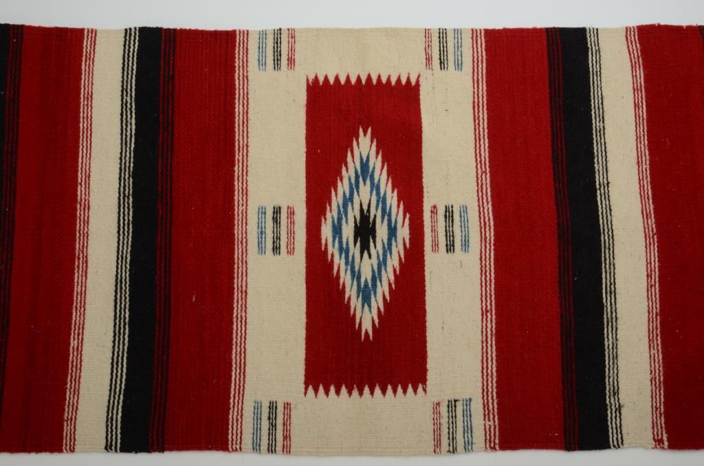 Mexican Chimayo rug approx. 44” x 22” and in overall very good condition showing a pleasing design in red, white, blue and black. Est.: $200-$400.