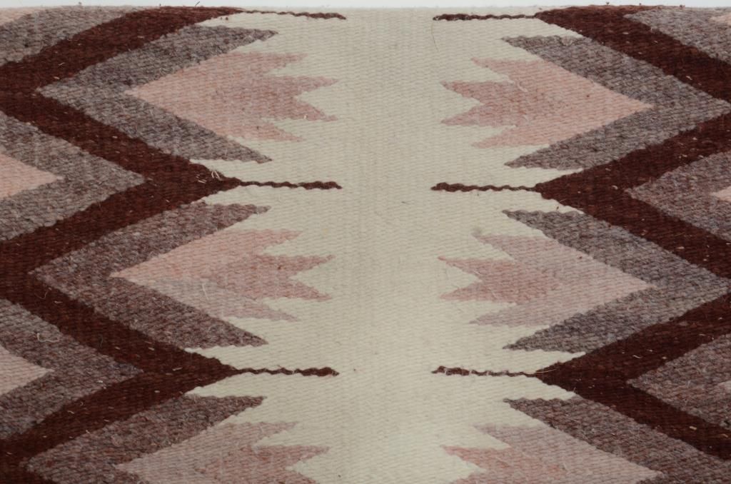 Mexican Chimayo woven rug approx. 31” x 64” in overall very good condition with great pattern and tan, rose, pink and maroon colors. Est.: $100-$200.