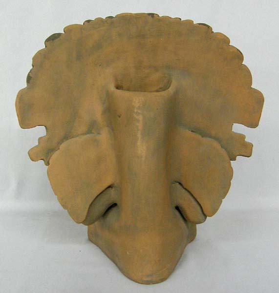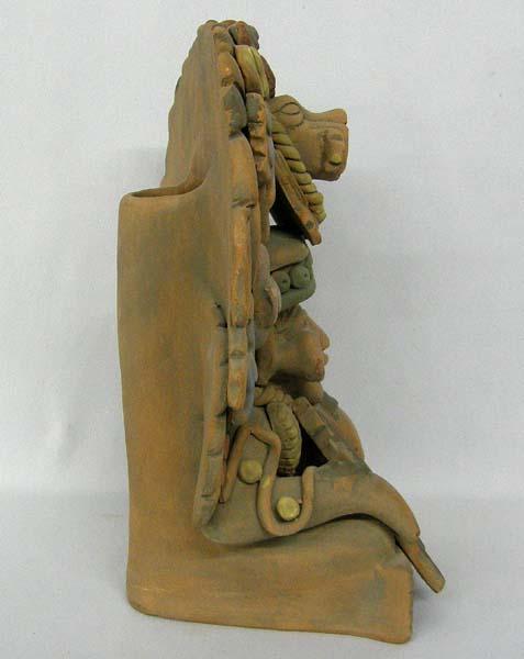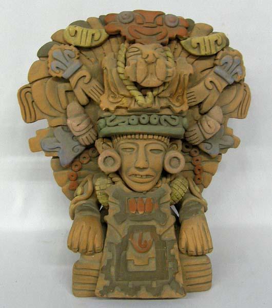 Mexican Clay Mayan Style Statue, MUST BE PICKED UP. There is a repaired crack on the headdress. Measures approx. 11''Hx10.5''Wx6.5''D.