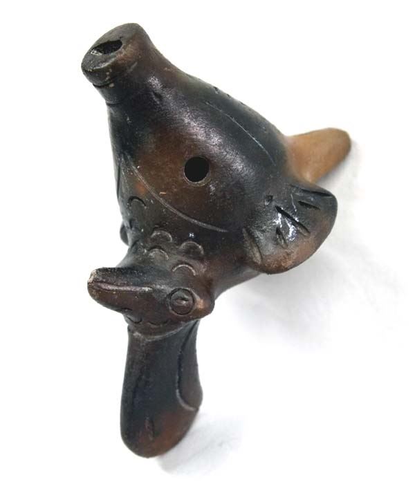Unusual Mexican Clay Multi-Animal Whistle, measures 5'' x 5.5''H, 5 animals in one whistle, includes fish, cat, toucan, chicken, and elephant