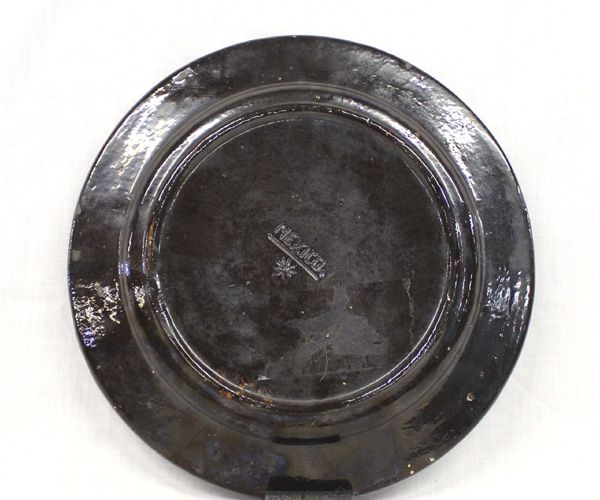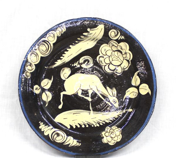 Mexican Glazed Deer Plate, measures 11''D and features a deer eating with the clouds above surrounded by flowers