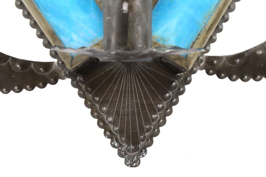For your consideration in this lot we have a Mexican Colonial Style Wall Mounted Candle Holder originating from the early 20th century. The piece is constructed out of thin sheets of tin that have been shaped and welded together. The candle holder shows four pieces of blue glass or resin set into the sides of the central diamond shape on each of the sides. The piece shows hand tooled designs across the surface of the wall mount. The back of the candle holder is marked reading "Rebecca Montoya" along with a wall mounting loop. The piece shows good condition overall with some wear across the candle holder. The piece measures 10" wide by 12 1/2" tall.