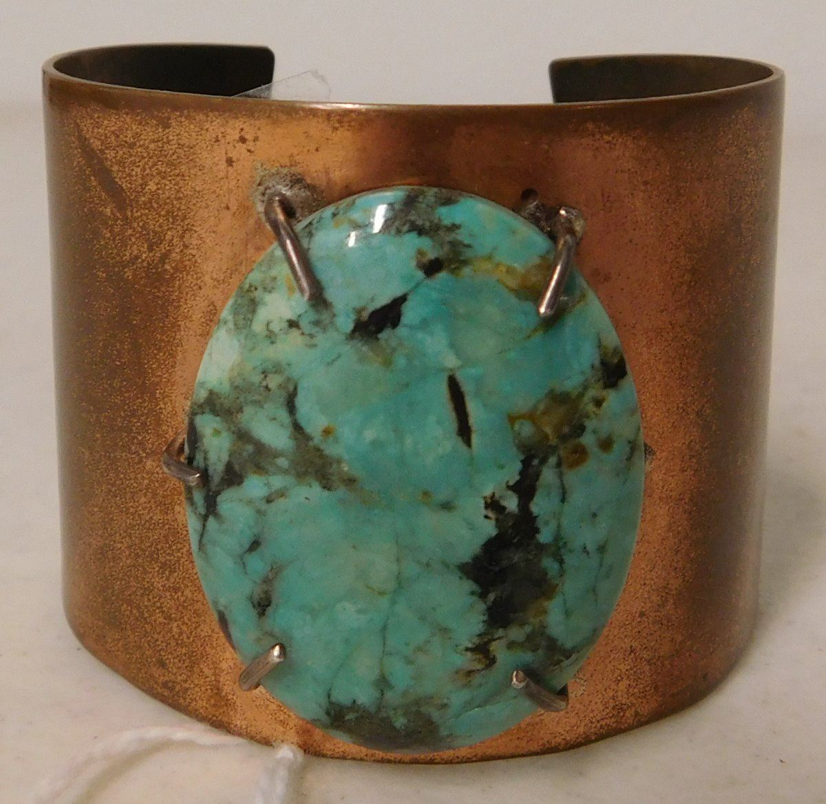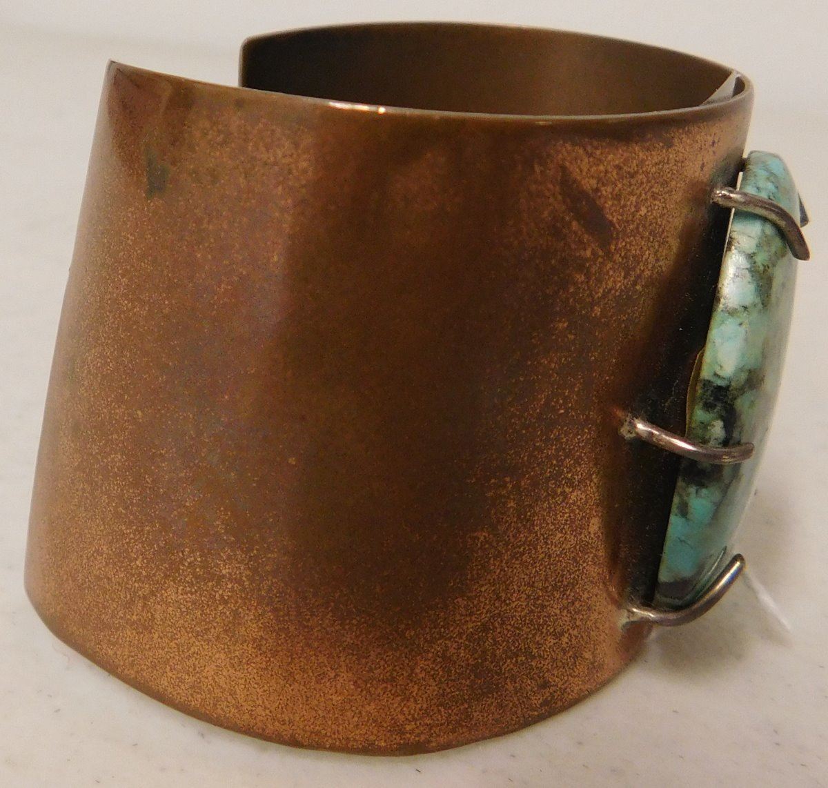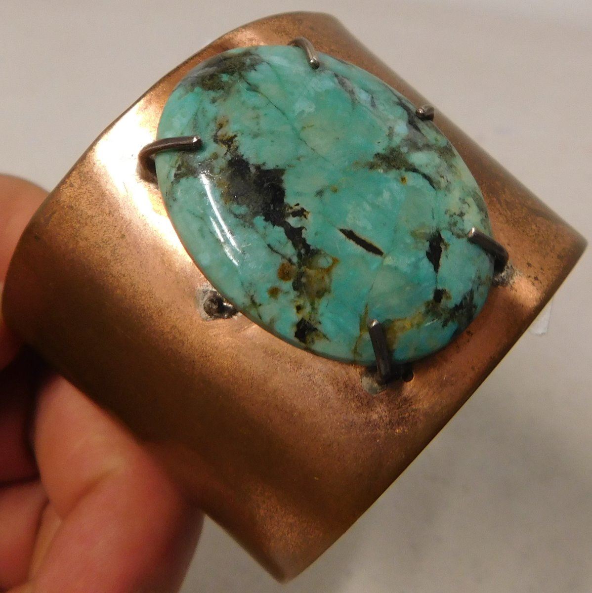 Mexican Copper & Turquoise Bracelet, circa 1940s. Made of copper and turquoise, the item is 6" with a 1" opening. Mexico. Nice stone, weighs approx. 68.7 grams w/stonework. Condition: Good, nice patina, see images. Shipping: $15.50 w/insurance and signature.