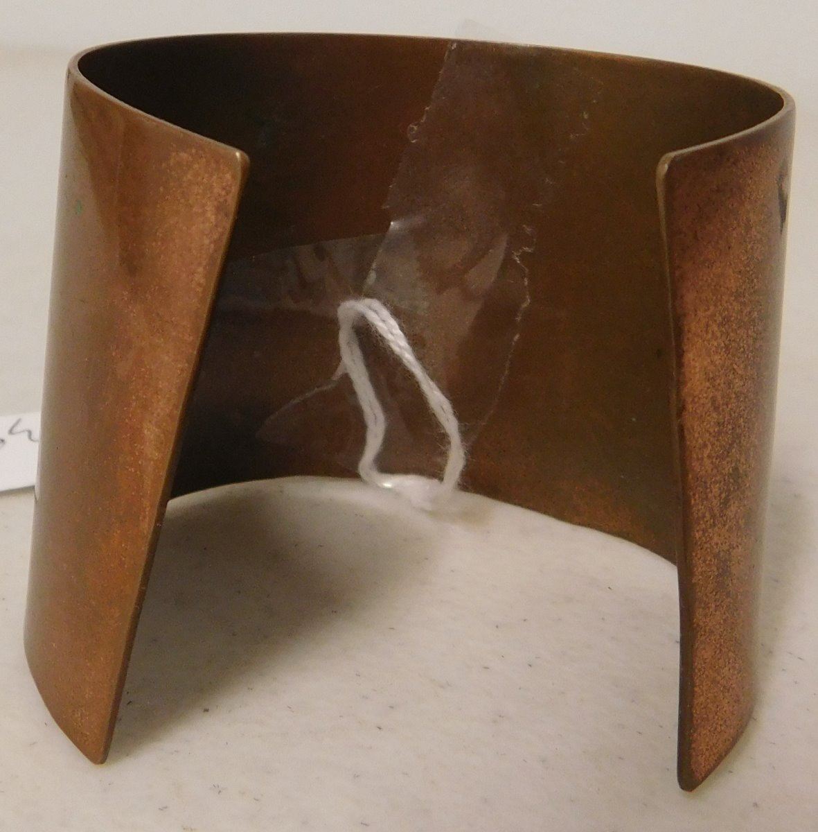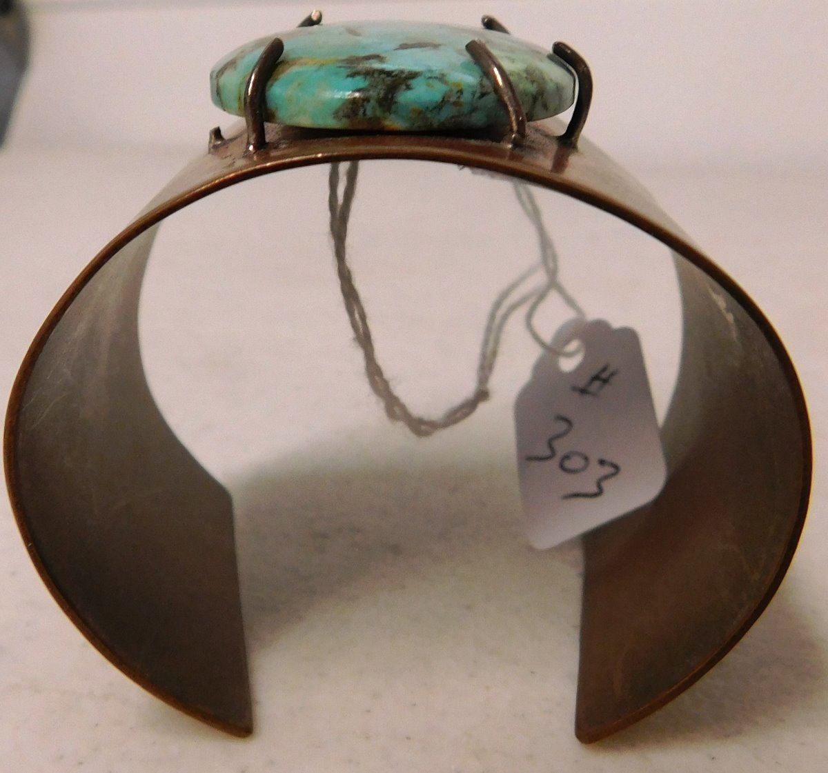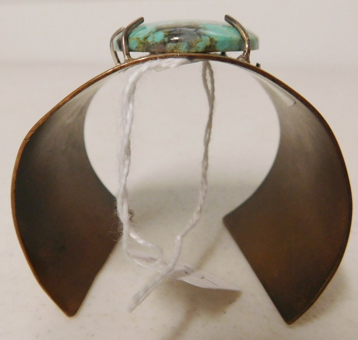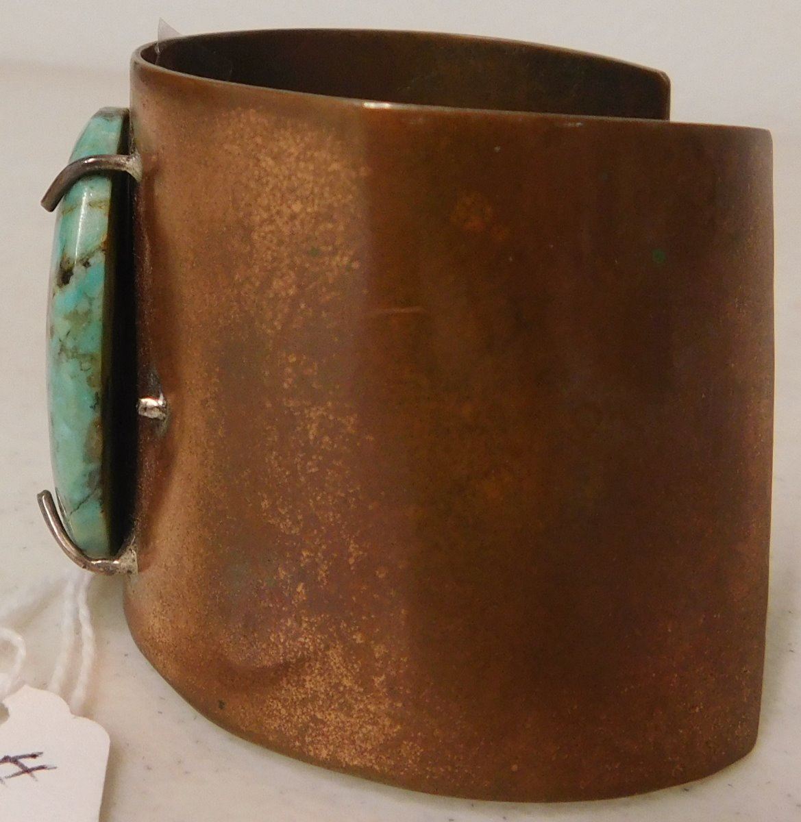 Mexican Copper & Turquoise Bracelet, circa 1940s. Made of copper and turquoise, the item is 6" with a 1" opening. Mexico. Nice stone, weighs approx. 68.7 grams w/stonework. Condition: Good, nice patina, see images. Shipping: $15.50 w/insurance and signature.