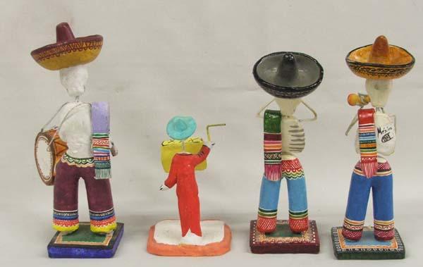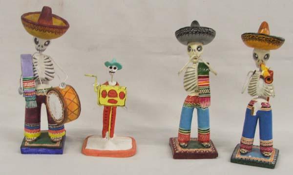 4 Mexican Day Of The Dead Pottery Figures. Tallest measures approx. 7 1/2''. One is missing his instrument, one has a chip from lower torso and hands are broken. Buyers Pay Actual Shipping and Handling Charges(see terms and conditions for more information).