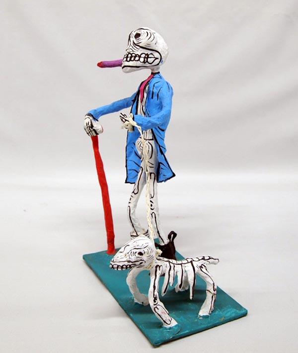 Mexican Day of the Paper Mache' Dead Art, Skeleton Figure walking with cane and skeleton dog on leash smoking cigar, measures 7.5''W x 9.75''H. Buyers Pay Actual Shipping and Handling Charges(see terms and conditions for more information).