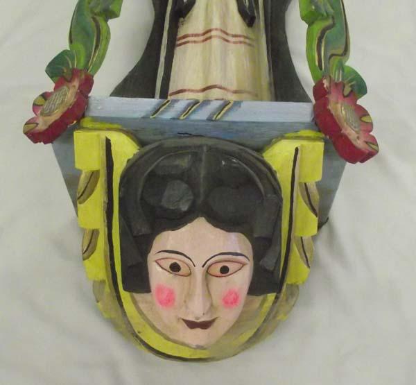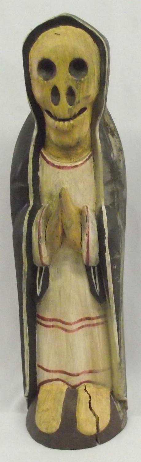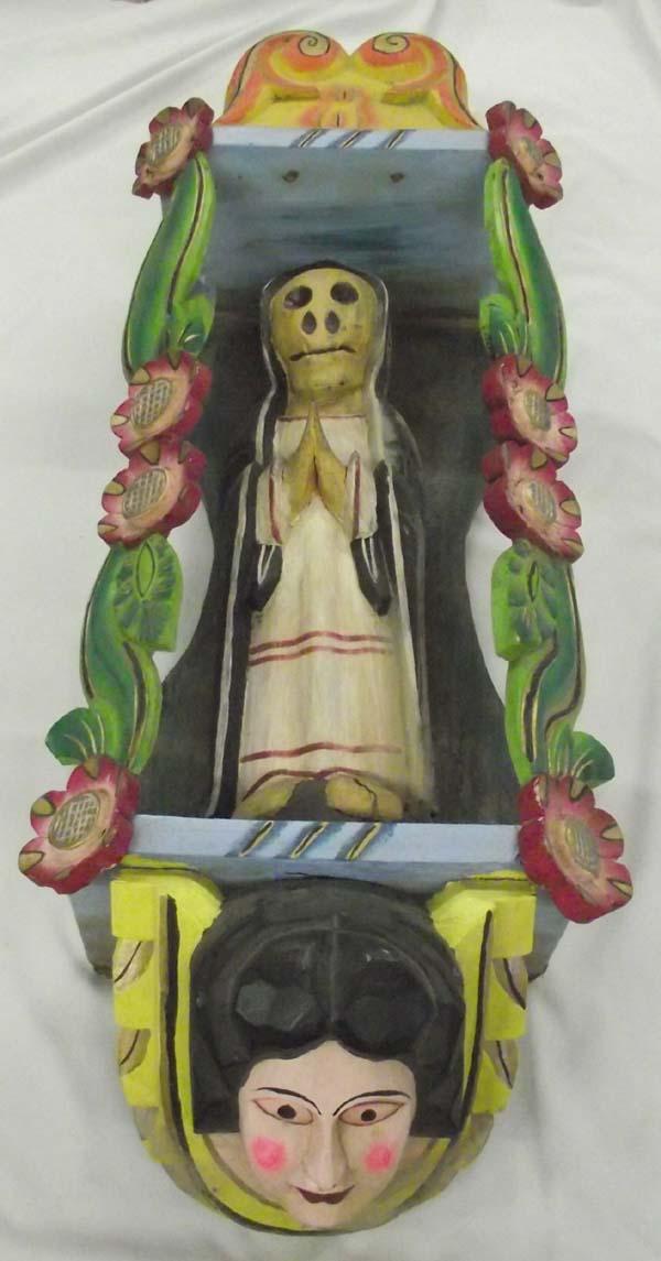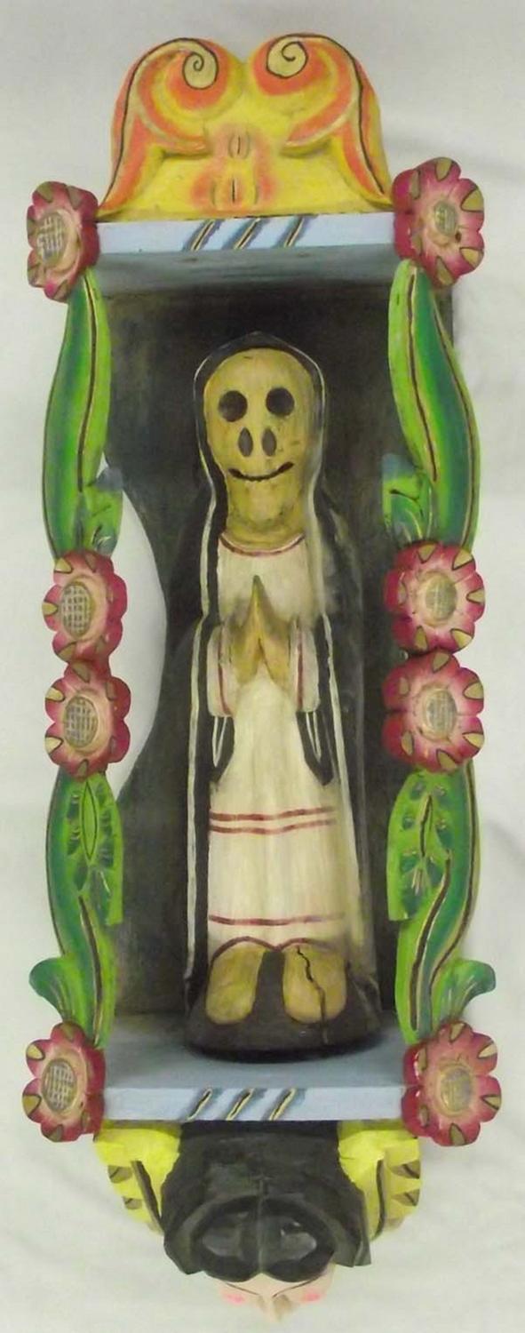 Mexican Day of the Dead Bulto in Ornately Carved Display, Day of the Dead Figure has folded hands in prayer and is wearing long black hooded robe, wooden display has brightly colored carved flowers and on the bottom has a ladies head similar to a figure head on a ship, display measures approx. 44'' x 17'' x 12'' and Santo measures approx. 24.5''L x 6.5''W x 8''H. Buyers Pay Actual Shipping and Handling Charges(see terms and conditions for more information)