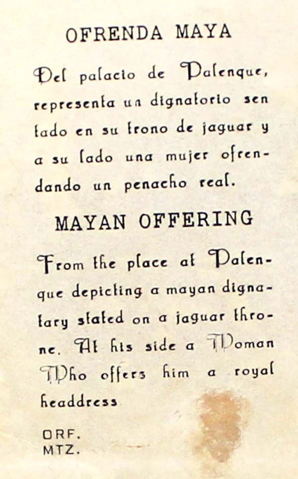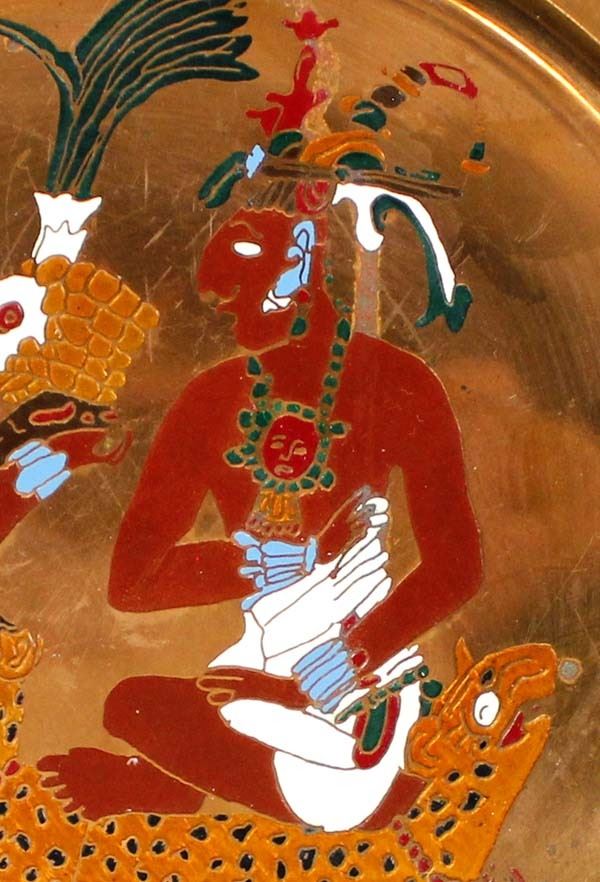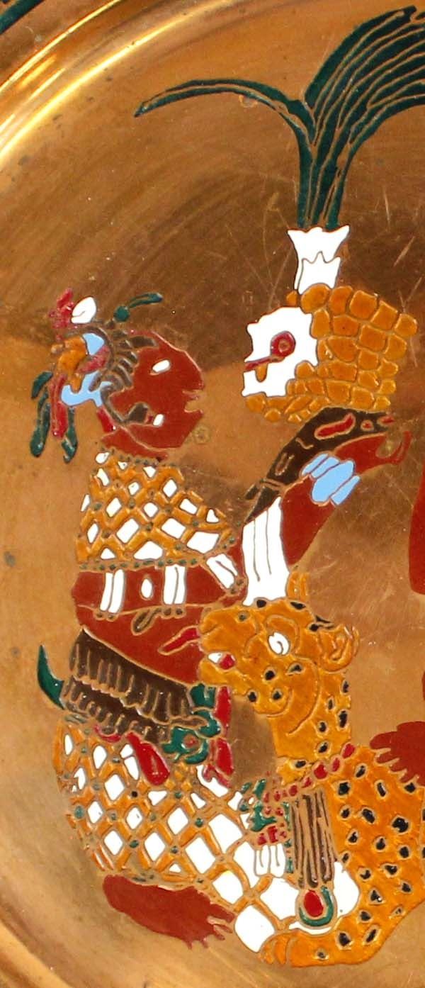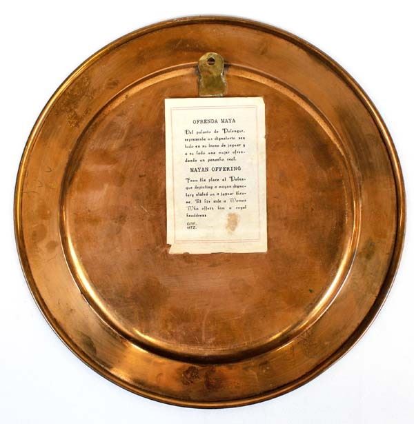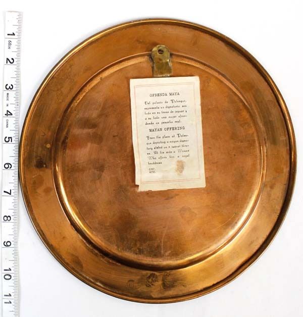 Mexican Decorative Copper Plate ''Mayan Offering'', measures 11''D, ''From the place of Palenque depitcting a Mayan dignatary seated on a jaguar throne. At his side a woman who offers him a royal headdress.''