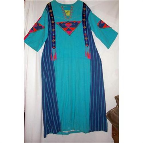 Beautifull caftan, from Mexican designer Josefa. In Mexico her clothing gets the big bucks. Made from high quality algodon (cotton) and designer details, make this one of a kind. The caftan is 53 inches long from neck to hem, 41 inches from armpit to armpit, and the three quarter inch sleeve is 14 inches and the skirt has slit pockets, and the hip measurement is 52, so it is a good size. In very good condition, no holes, no stains. Thank You for shopping in the Land of Enchantment.