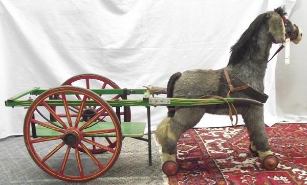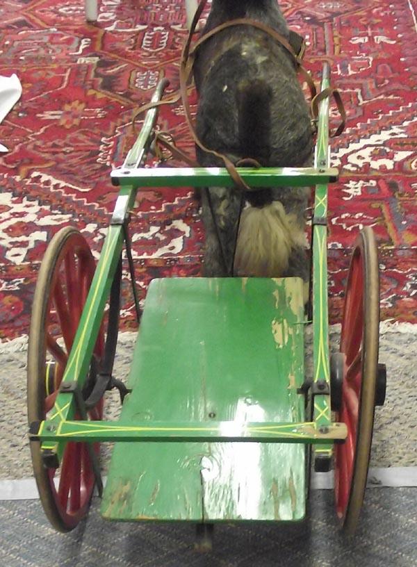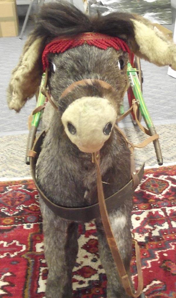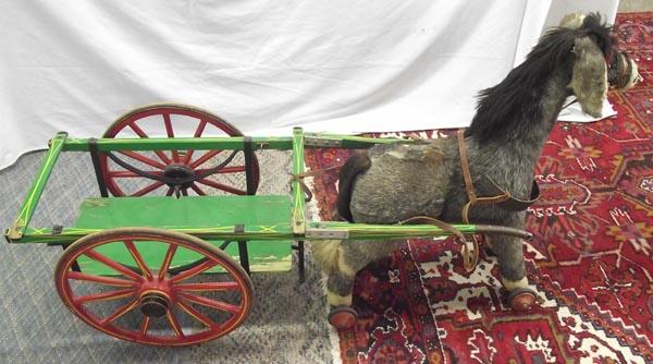 Mexican Donkey and Cart, Stuffed Toy Donkey is on Wheels and is made of some real and some synthetic hair, cart is attached to donkey with leather harness, donkey measures approx. 29.5'' x 28'' and cart measures approx. 49.5''L x 18.5''H x 22''W. MUST BE PICKED UP
