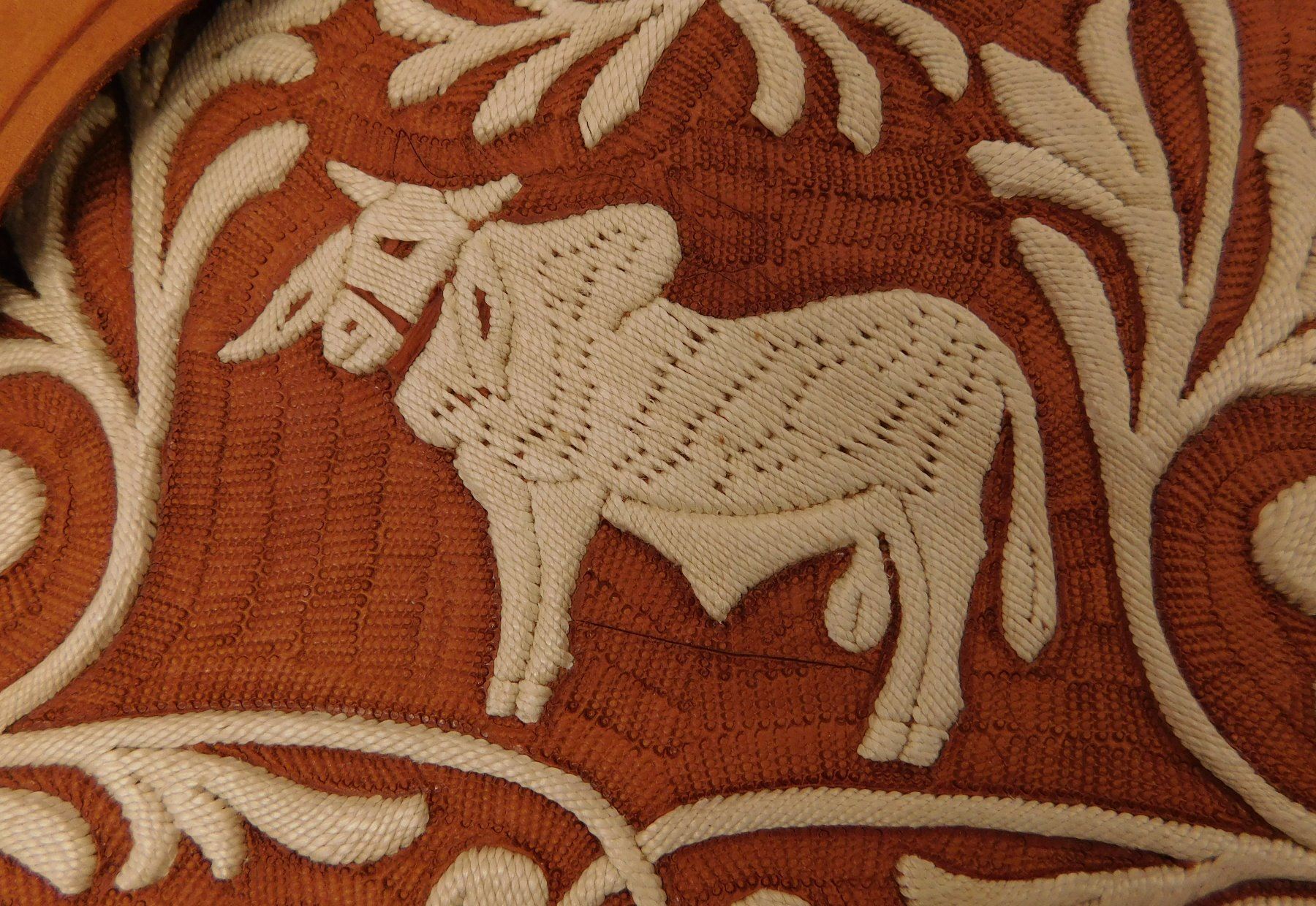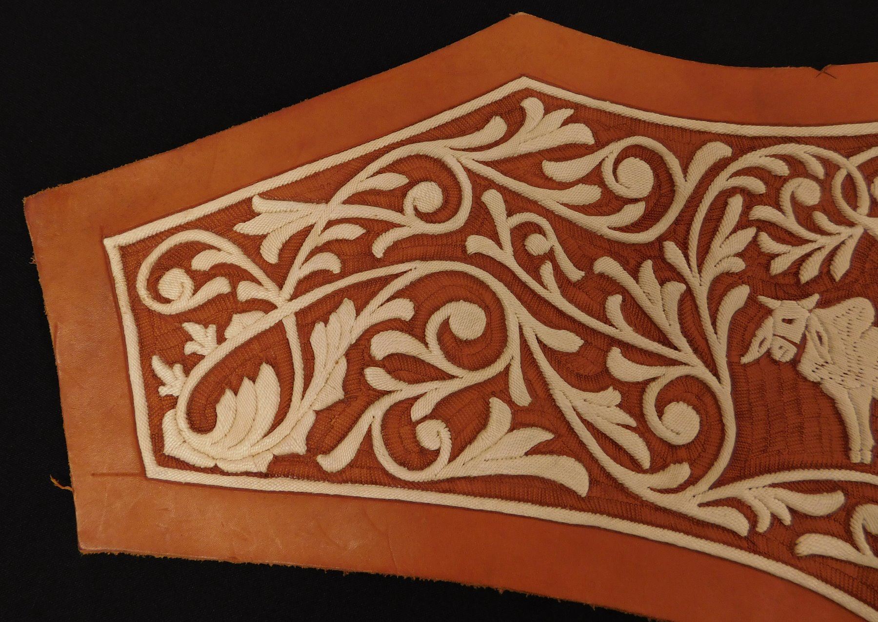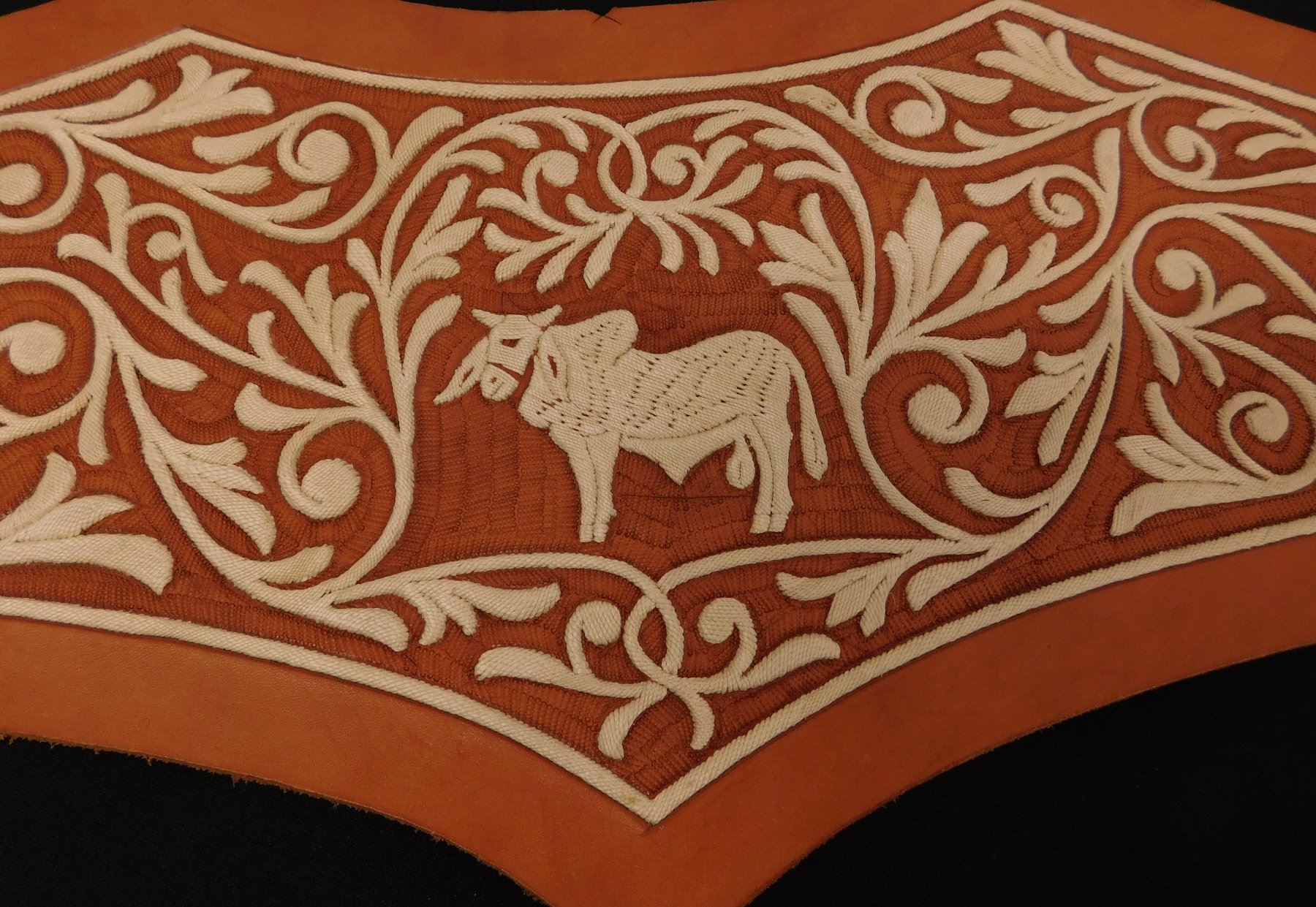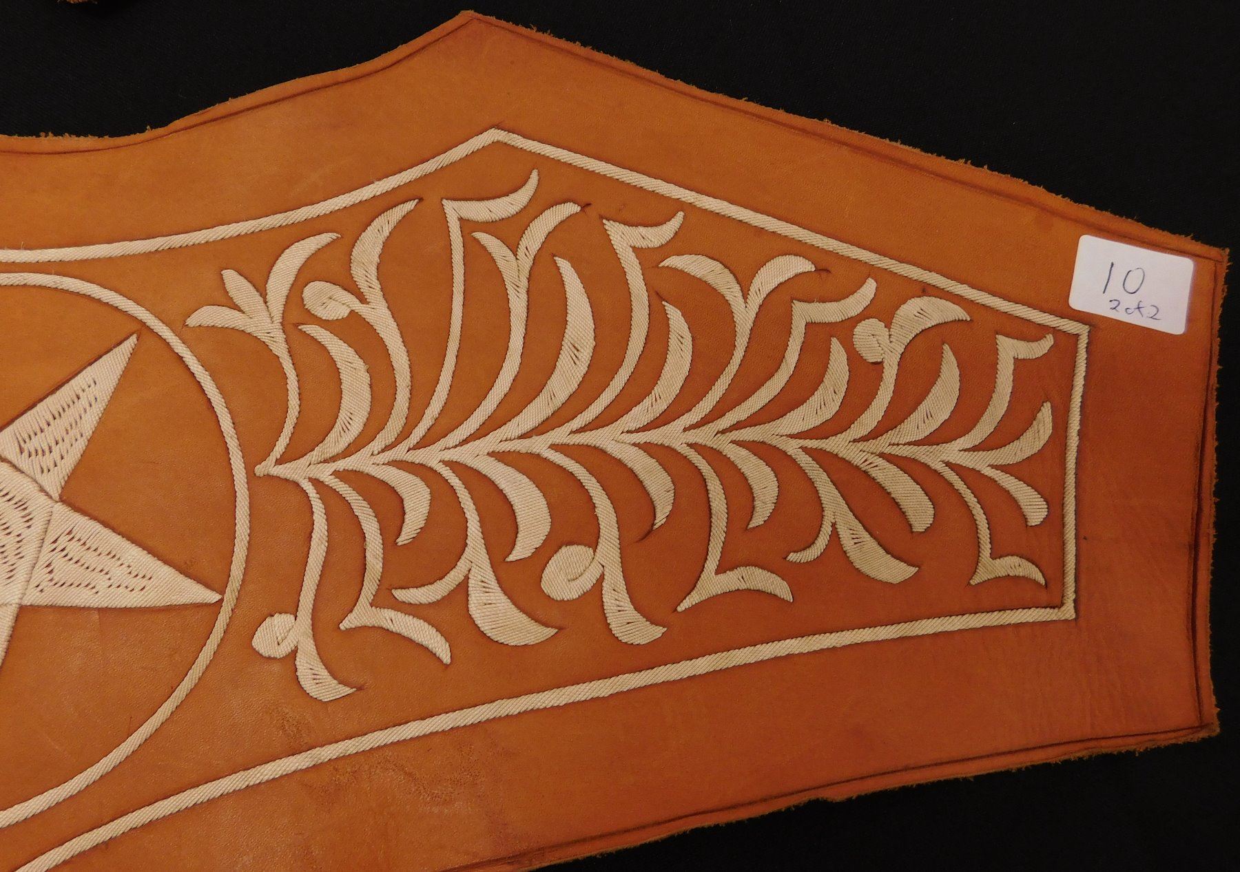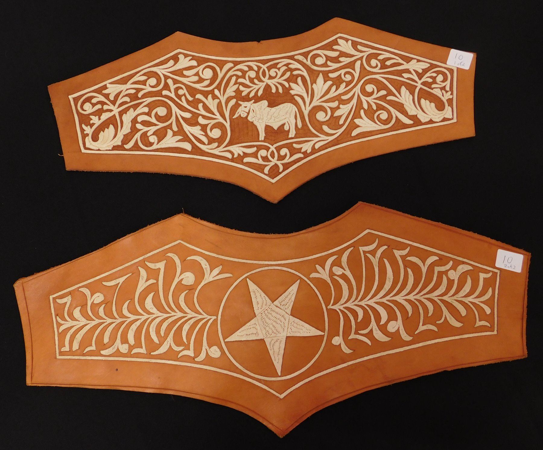 Mexican Embroidered Leather, circa 1950s. Made of cloth and leather, the items measure 19" x 9" and 21" x 9". Mexico. 2 pieces with a brahma bull and star design. Could be sewn on the back of a jacket. Condition: Some wear, see images. Shipping: $25.50 w/insurance and signature.