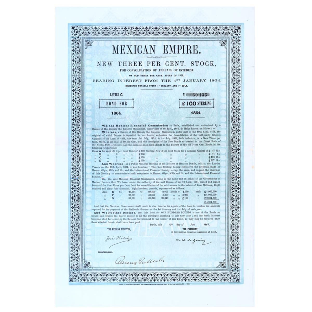 1864, Mexico. Letter G Bond for 100 pounds sterling bearing 3% interest. Black with light blue background. Attached coupons at right. Folds. Uncancelled and very fine. Taking advantage of the Civil War, Napoleon III established Austrian Archduke Maximillian as Emperor of Mexico and sent French troops including the Foreign Legion to support him against the Mexicans who wanted no part of this imperial powerplay. The United States was incensed at this threat to sacred “Monroe Doctorine” and supported the revolutionary government against Maximillian as well as threatening Napoleon III with war. Napoleon withdrew his troops leaving Maximillian to the firing squad. This security was part of the financing of the Mexican Empire.