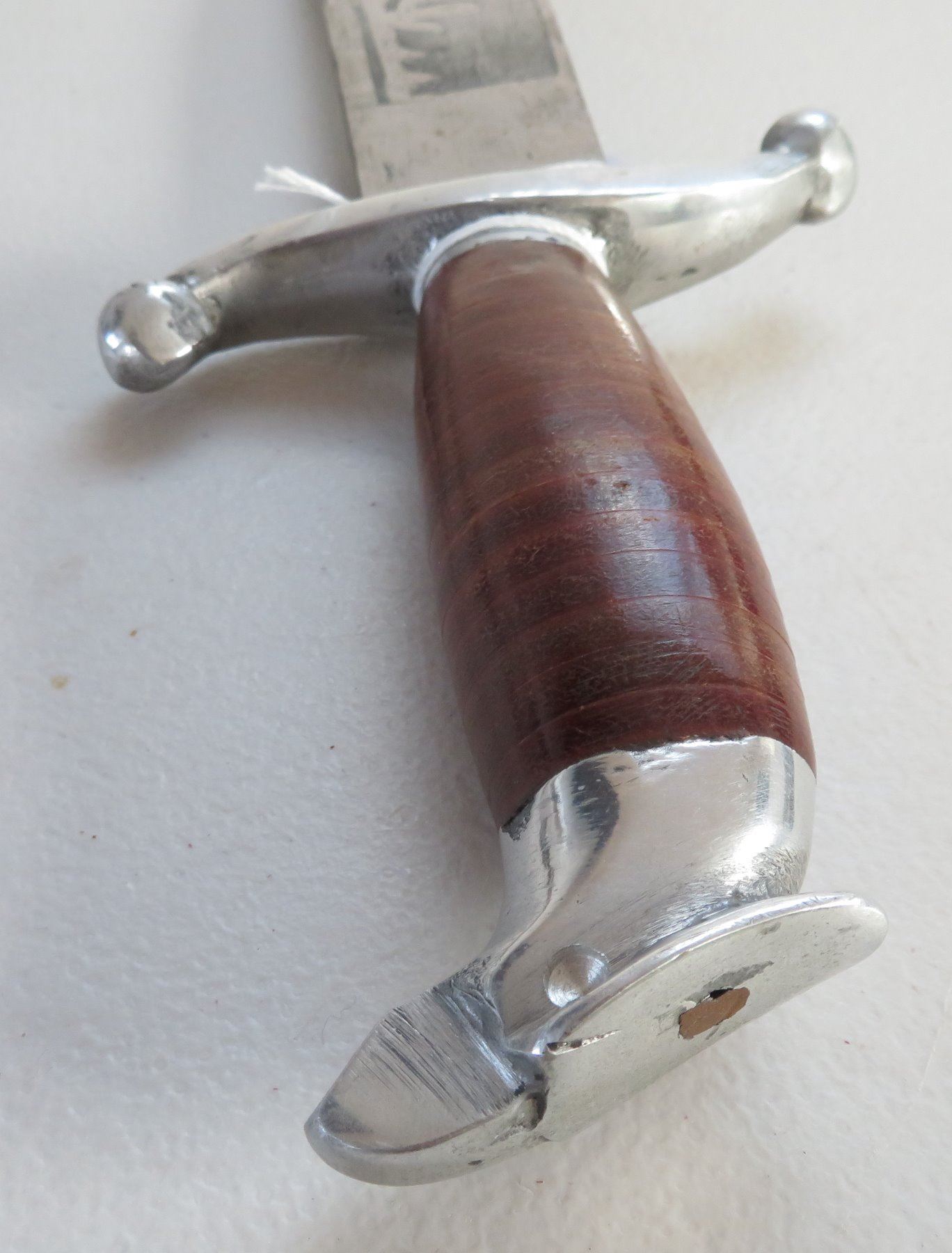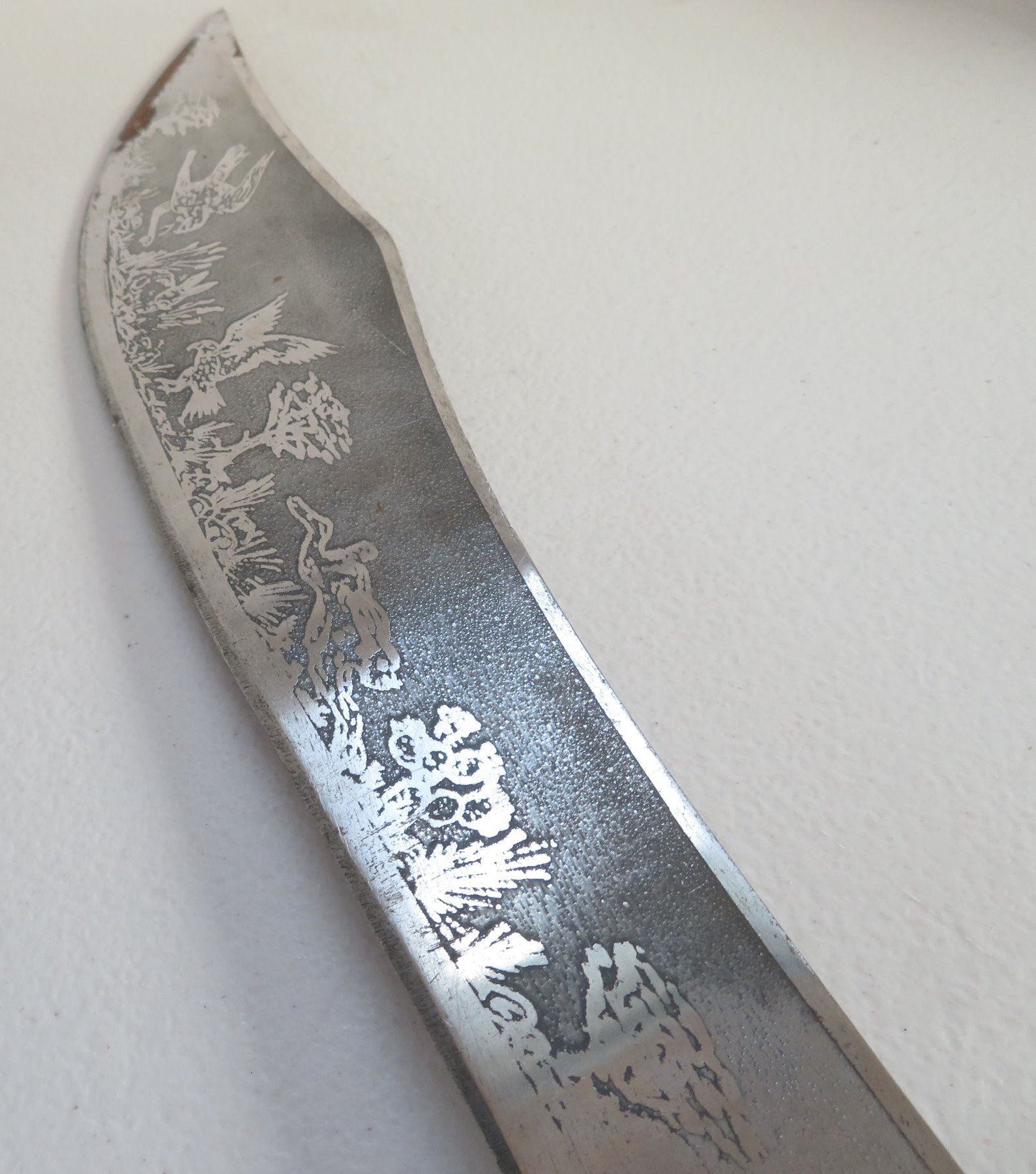 Mexican Engraved Sword, c. 1940s. Made of leather, steel and aluminum, the item measures 23" x 3 1/2". Mexico. Inscription on blade, eagle effigy handle, sharp! Loosely translates lates to "when you see me shine, prepare for death." Condition: Some rust, see images. Shipping: $40.00 w/insurance and signature, due to size and weight.