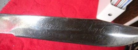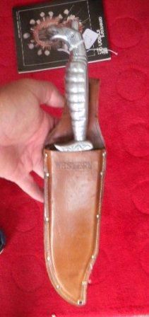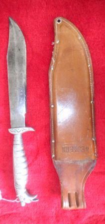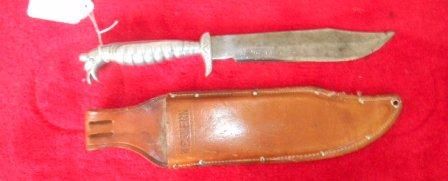 Mexican Fighting Knife with an overall length of 14 inches. Inscription on steel blade with bird effigy handle. Cow hide scabbard. Circa 1940. Shipping $15.00