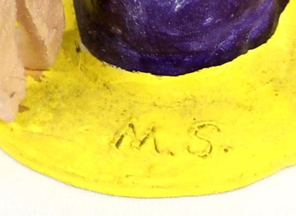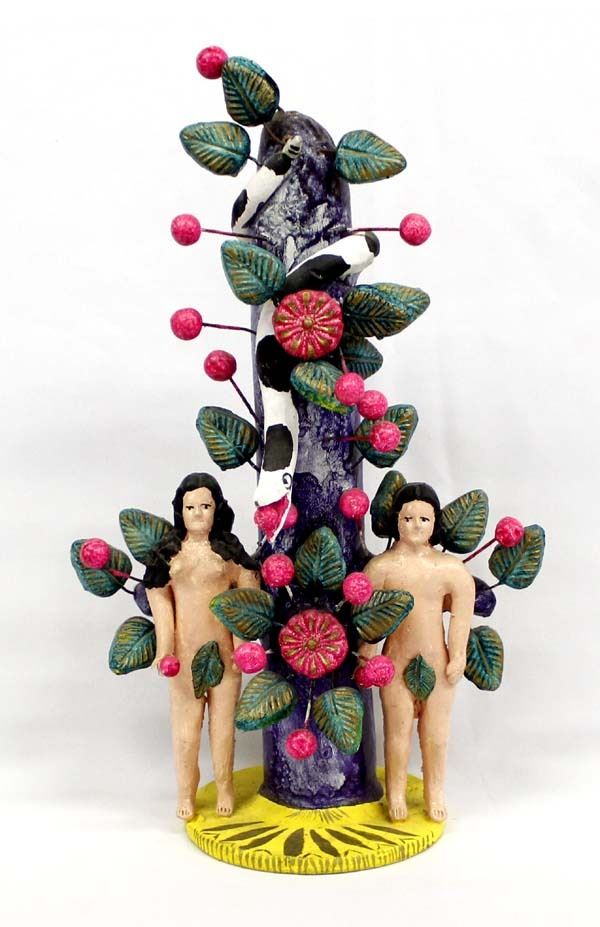 Mexican Folk Art Pottery Adam and Eve Candleholder, measures 10.5'' x 17'', has the initials M.S. etched on the base