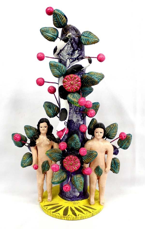 Mexican Folk Art Pottery Adam and Eve Candleholder M. Soteno, measures 10.5'' x 17'', has the initials M.S. etched on the base, ''The Soteno family of Metepec is one of the main families of ceramic artisans specializing in sculptures called Trees of Life which have made the town found in the State of Mexico one of Mexico's main ceramic centers.''