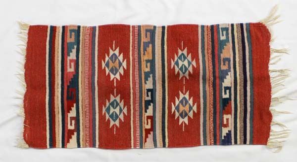 Mexican Fringed Textile Rug, measures 18'' x 37'' which does not include the fringe in the measurement