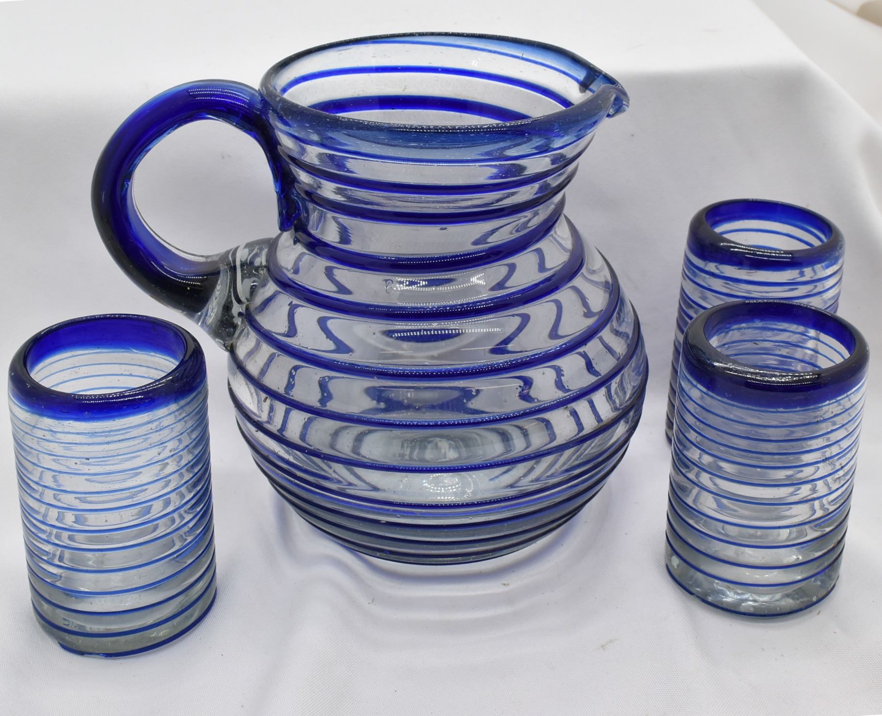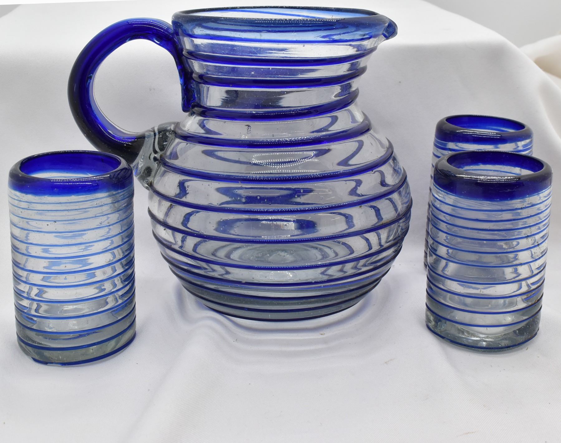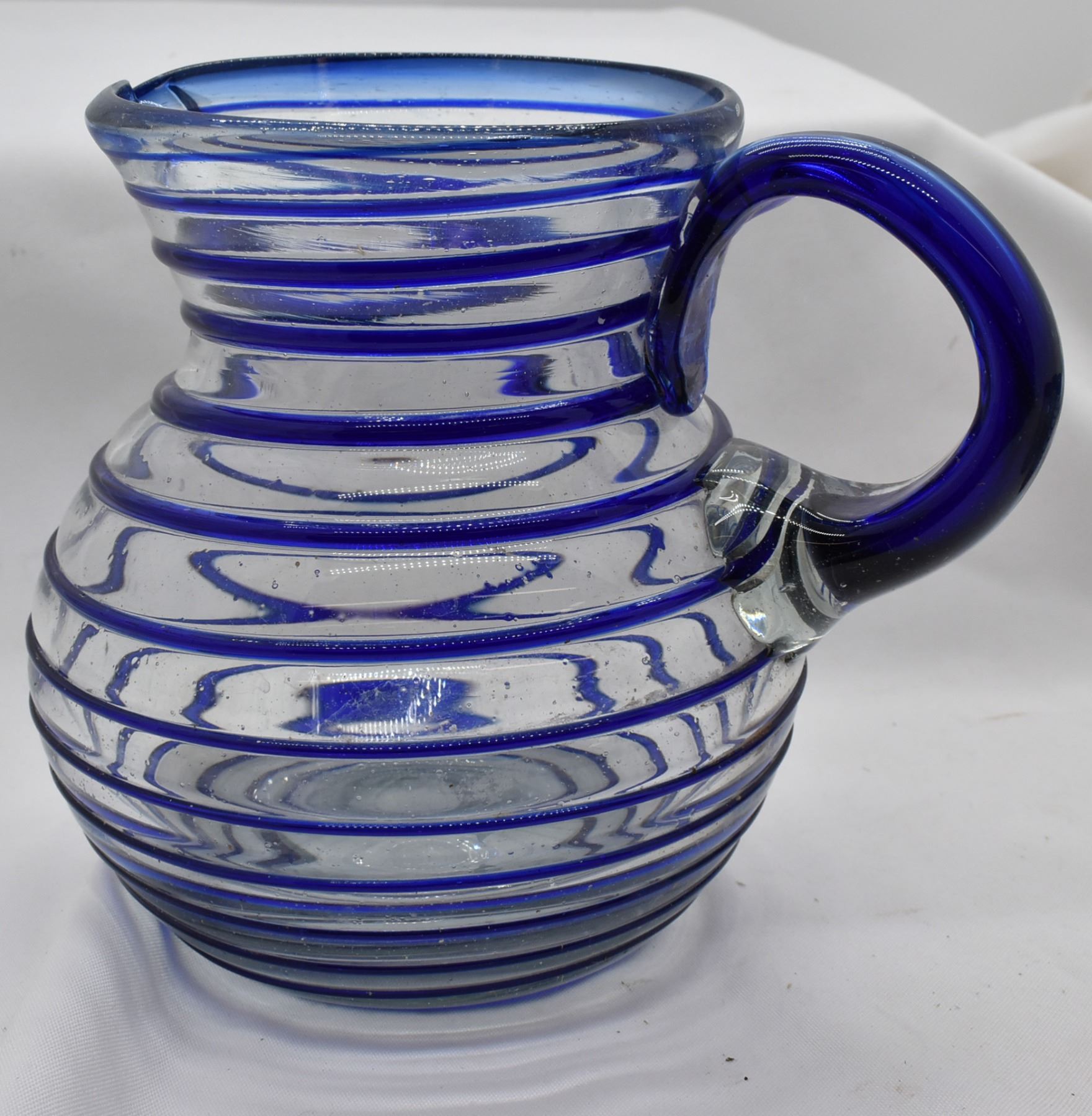 Mexican Glass Pitcher and 3 Matching Glasses, pitcher measures 6.5''D x 6.75''H x 8''