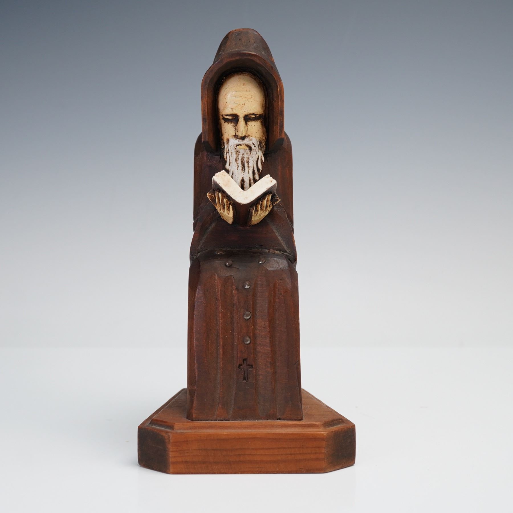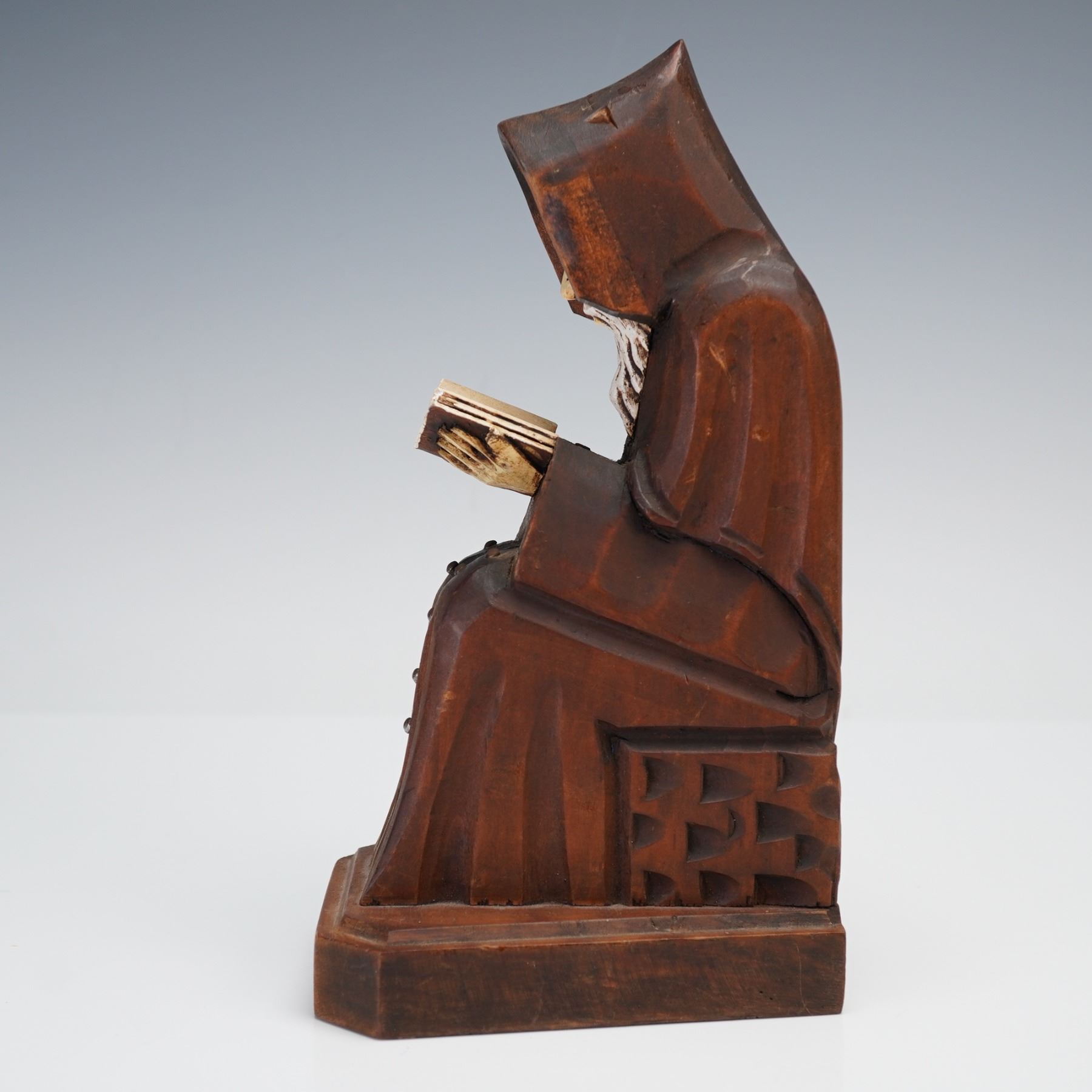 Wooden monk bookend depicting a hooded figure deeply engrossed in reading. The serene composition features a long-bearded monk seated with an open book, carved from a single block of wood and mounted on a hexagonal base. The figure's robe and cross detail are accentuated with subtle hand-finished contours, while the face and book are lightly painted in contrasting tones to highlight expression and texture. Likely crafted in Mexico, this piece combines folk art charm with devotional symbolism.