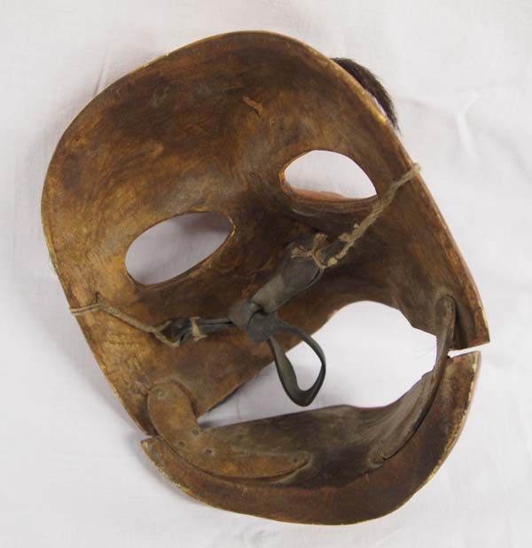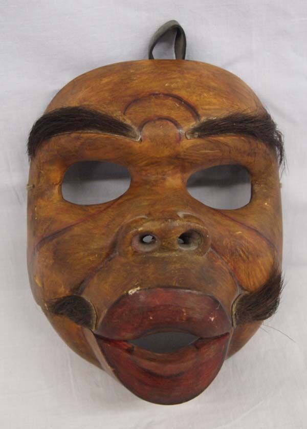 Mexican Hand Carved Wooden Dance Mask, hinged mouth, measures 8'' x 6'', features hair eyebrows and moustache, and big red lips, ready to hang