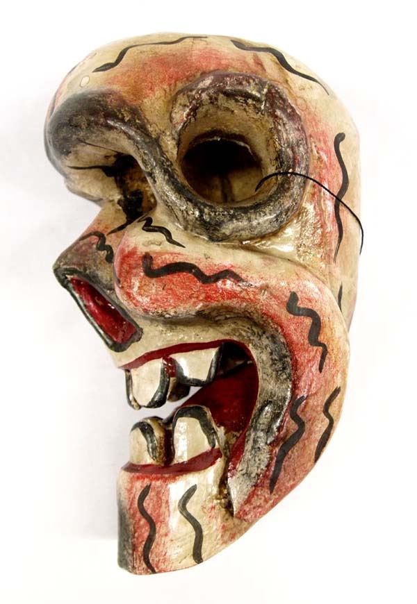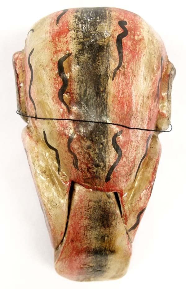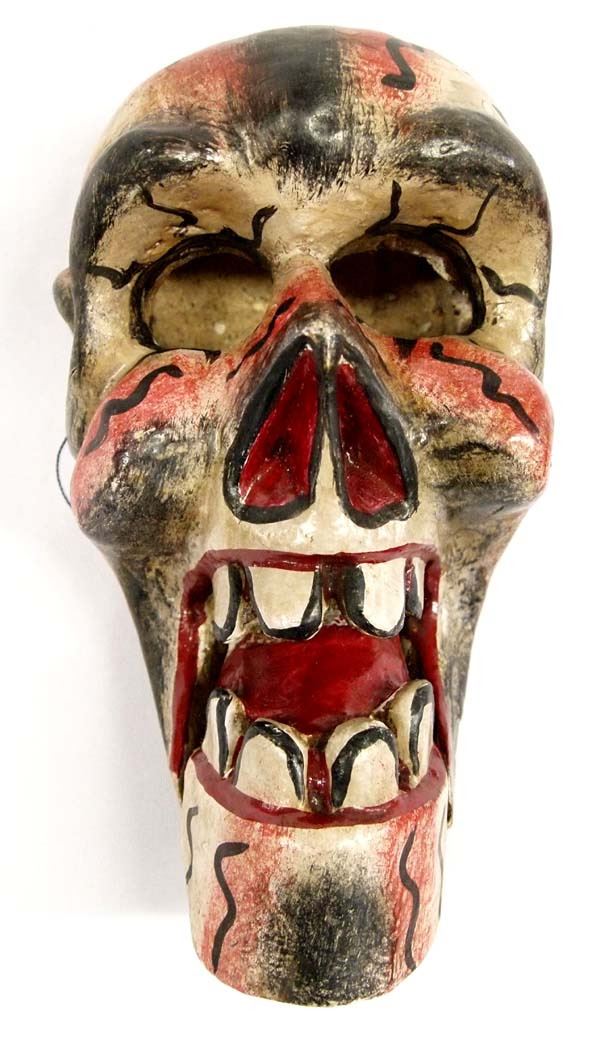 Mexican Hand Carved Wooden Skull Mask, articulated jaw and ready to hang, measures 5'' x 9''