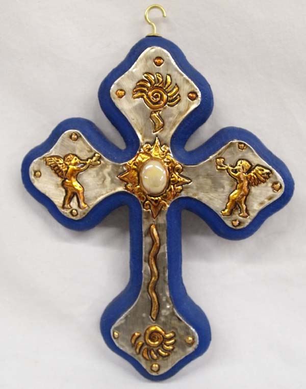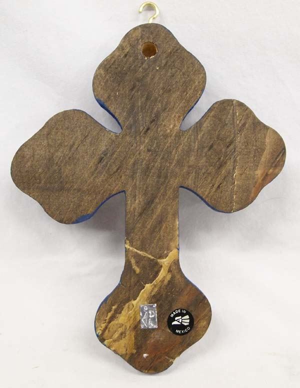 Mexican Hand Crafted Wood Cross, measures 8''L x 6.5''W, hammered metal and center cabochon, ready to hang
