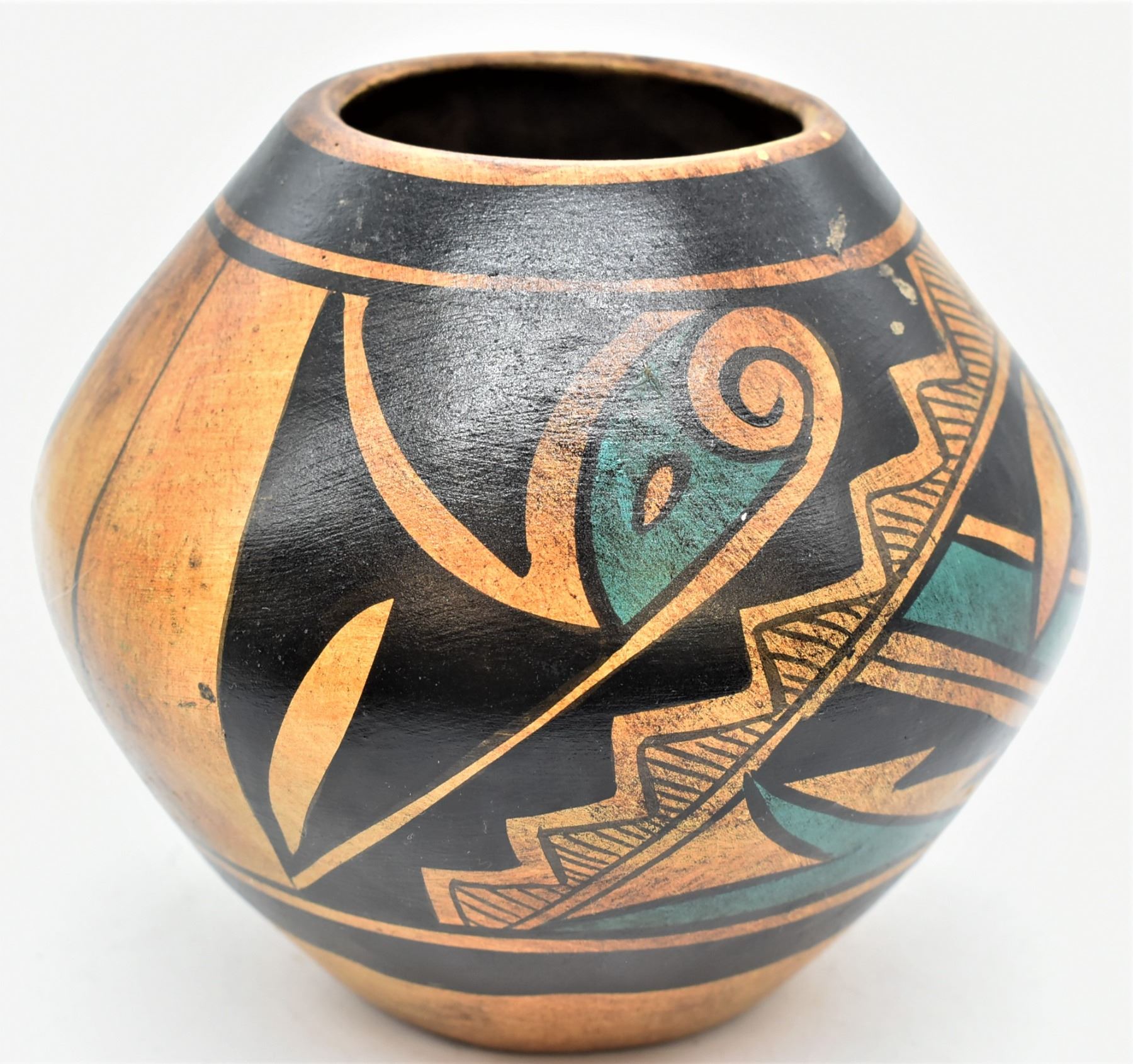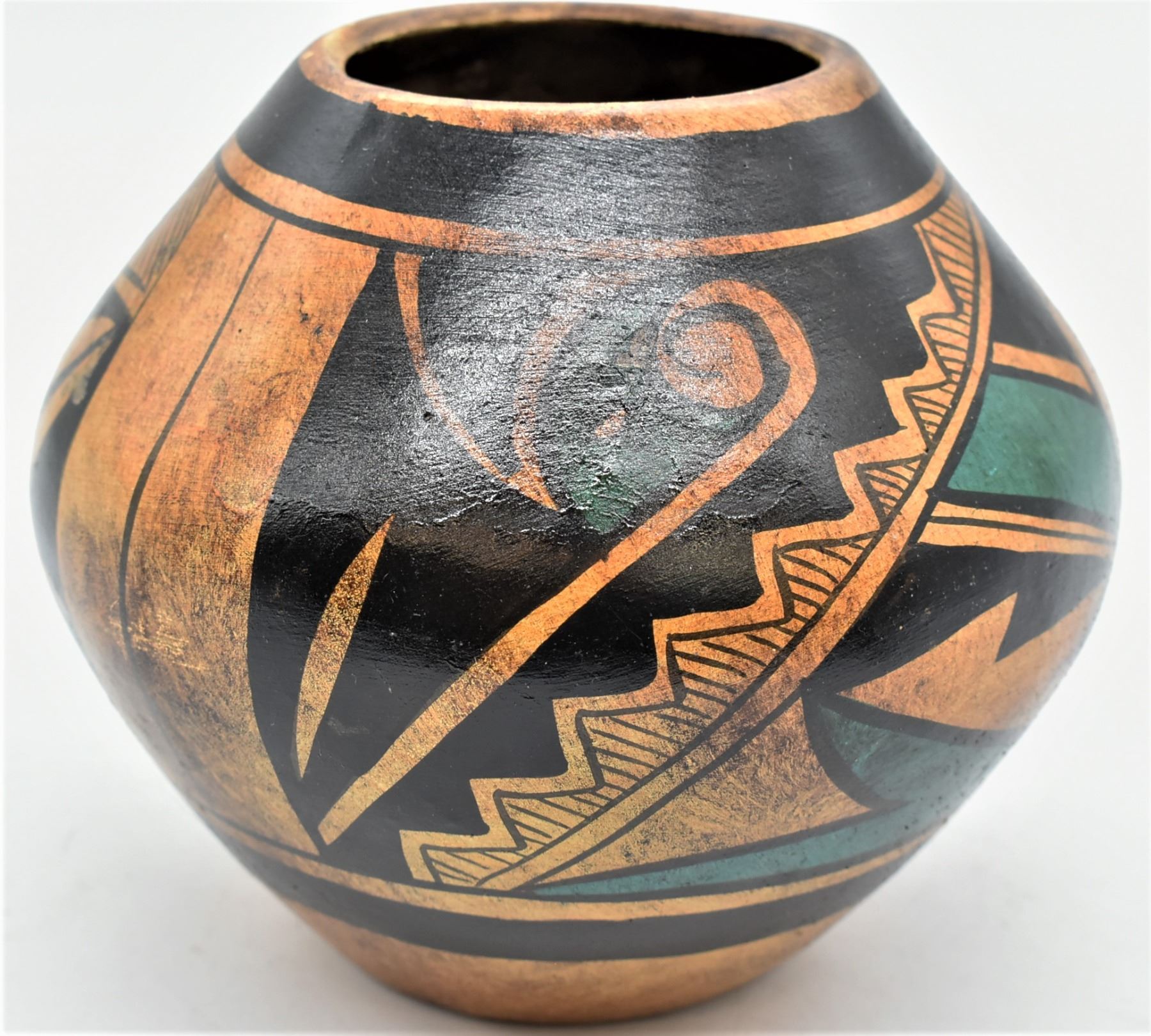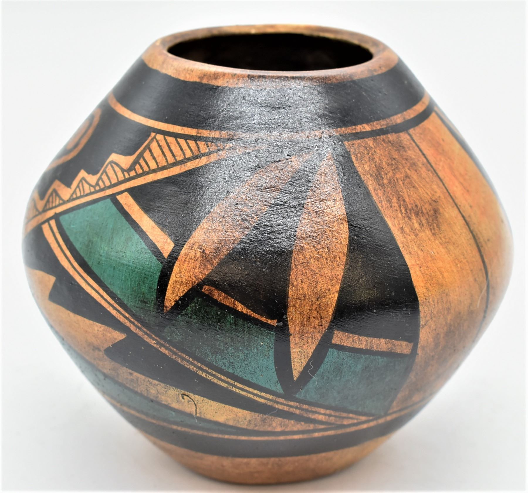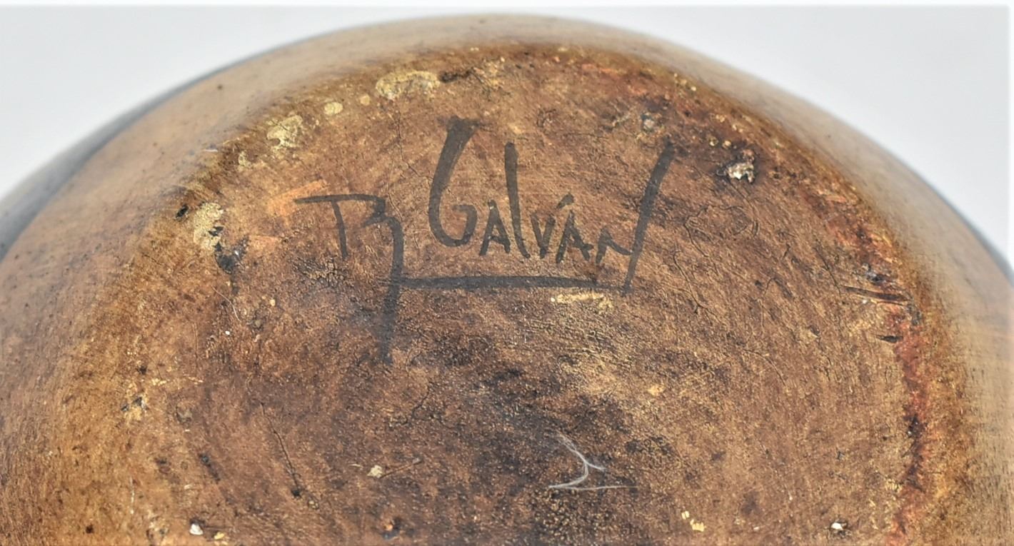 Mexican Hand Painted Pottery Jar by R. Galvan, measures 5.5'' x 6'' and is signed on the bottom, artist is deceased