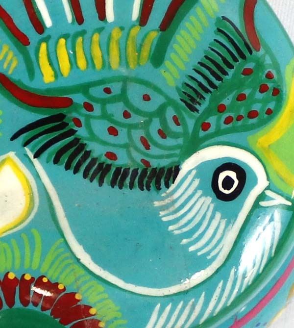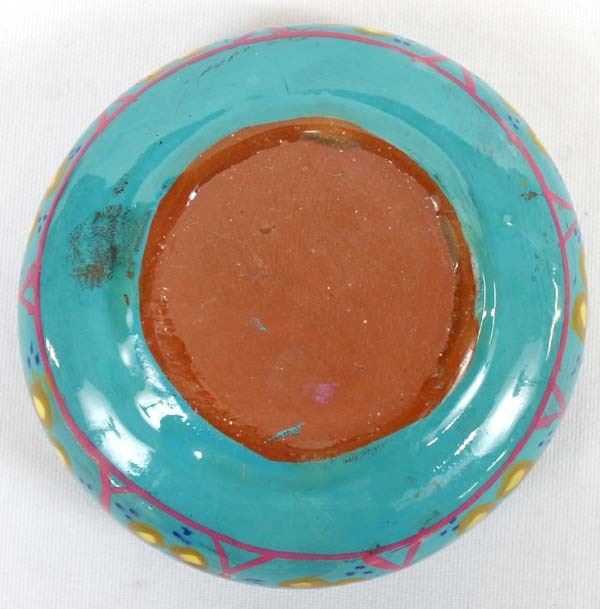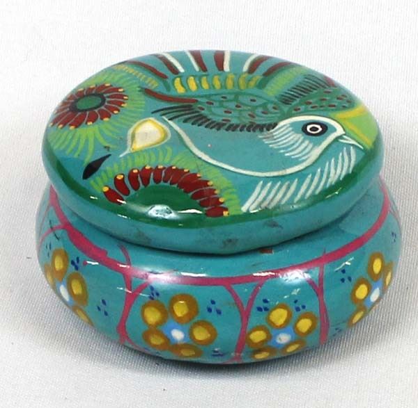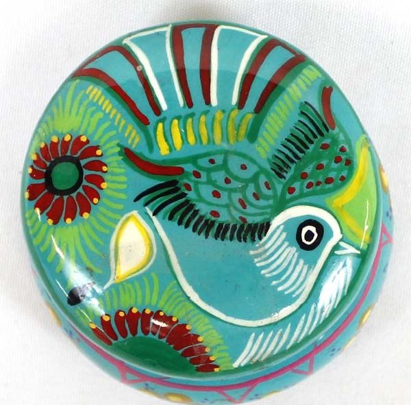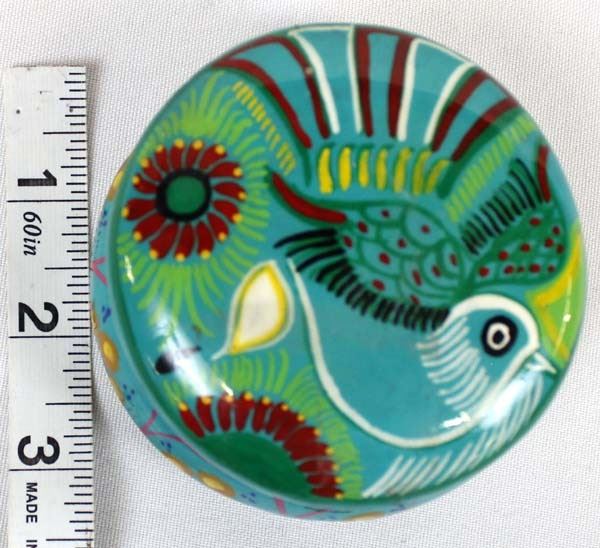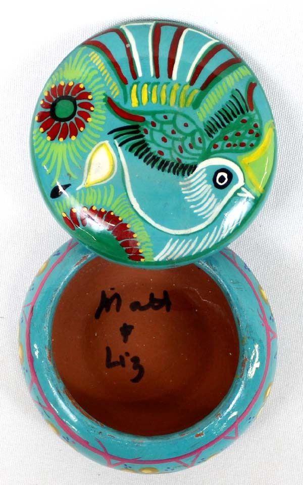 Mexican Handmade & Hand Painted Pottery Trinket Box by Matt & Liz. Vivid colors this item measures 2 1/2'' tall by 3'' in diameter.