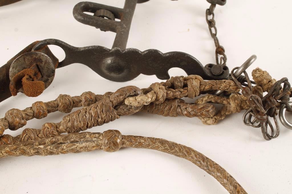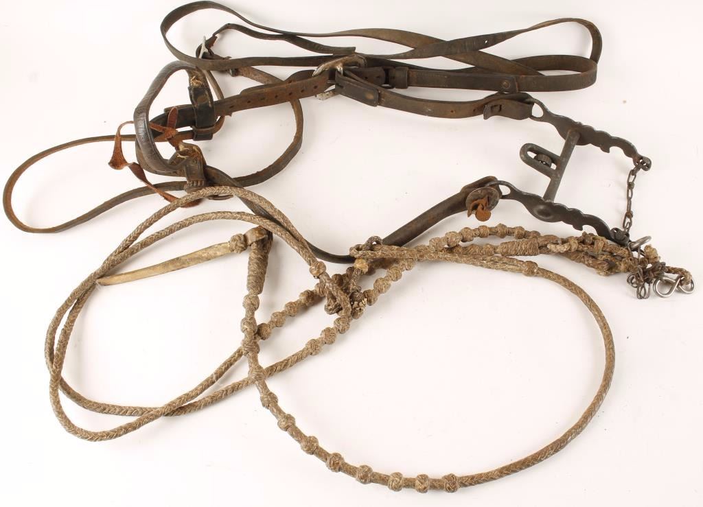 Braided rawhide reins. Bit is unmarked, shows age and use.