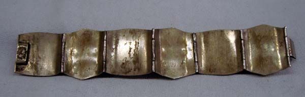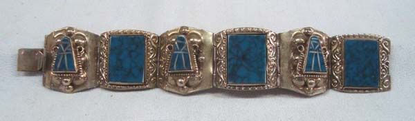 Mexican Jadeite Mayan Hallmarked Link Bracelet. Mayan designs in stone, 7''L, x .75''W with 6 hinged links and box clasp.