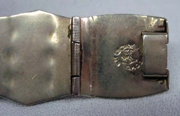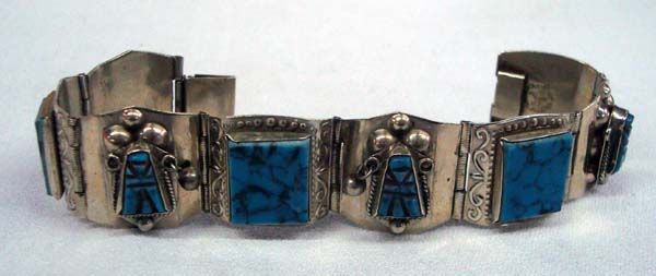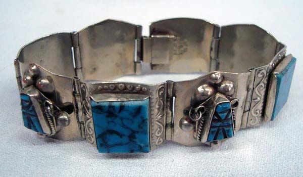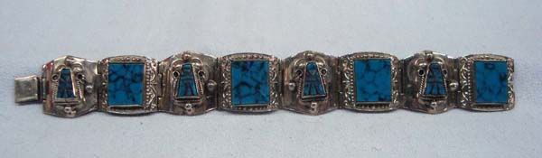 Mexican Jadeite Mayan Hallmarked Link Bracelet. Mayan designs in stone. Seven 7''L x .75''W. Hallmarked ''Mexico Silver''.