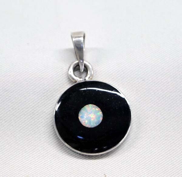 Mexican Round Pendant Jet and Opal. Sterling backing. Measures 3/4'' diameter. Buyers Pay Actual Shipping and Handling Charges(see terms and conditions for more information).