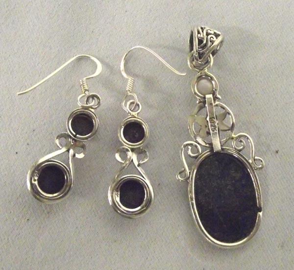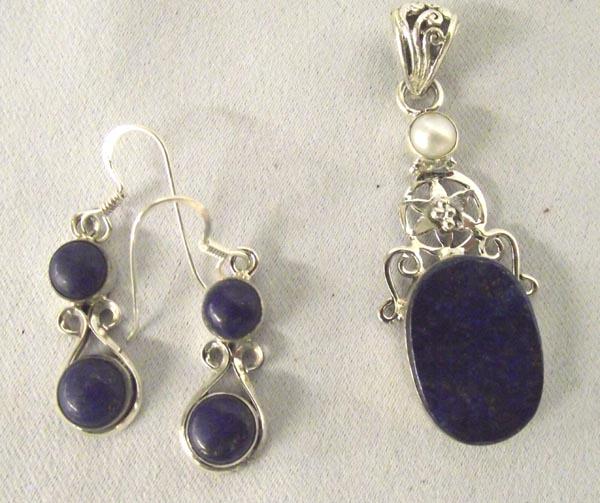 Mexican Sterling Silver Pendant and Earring Set. Lapis and pearl pendant, 2.25'' long. Earrings are lapis only, 1.5'' long. Buyers Pay Actual Shipping and Handling Charges(see terms and conditions for more information).