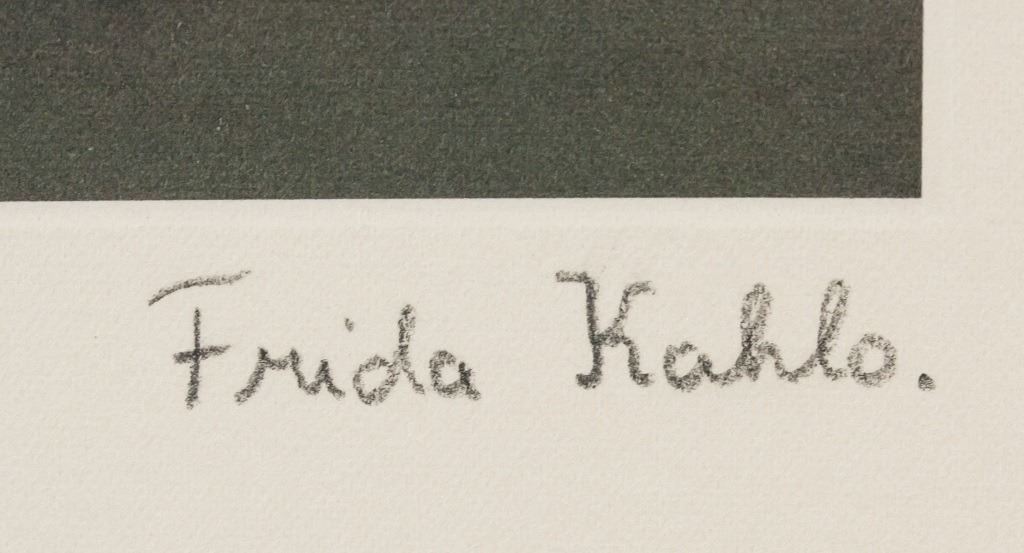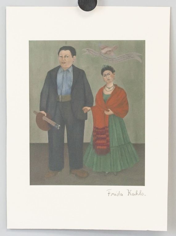 Lithograph on paper. Featuring portrait of Frida Kahlo with her husband, Diego Rivera. Signed "Frida Kahlo" to the bottom right. Plate size: 19 x 15 cm (7.5 x 6 in). Sheet size: 29 x 21 cm (11.5 x 8.25 in). Provenance: This lot carries limited provenance from a Southern Ontario estate
