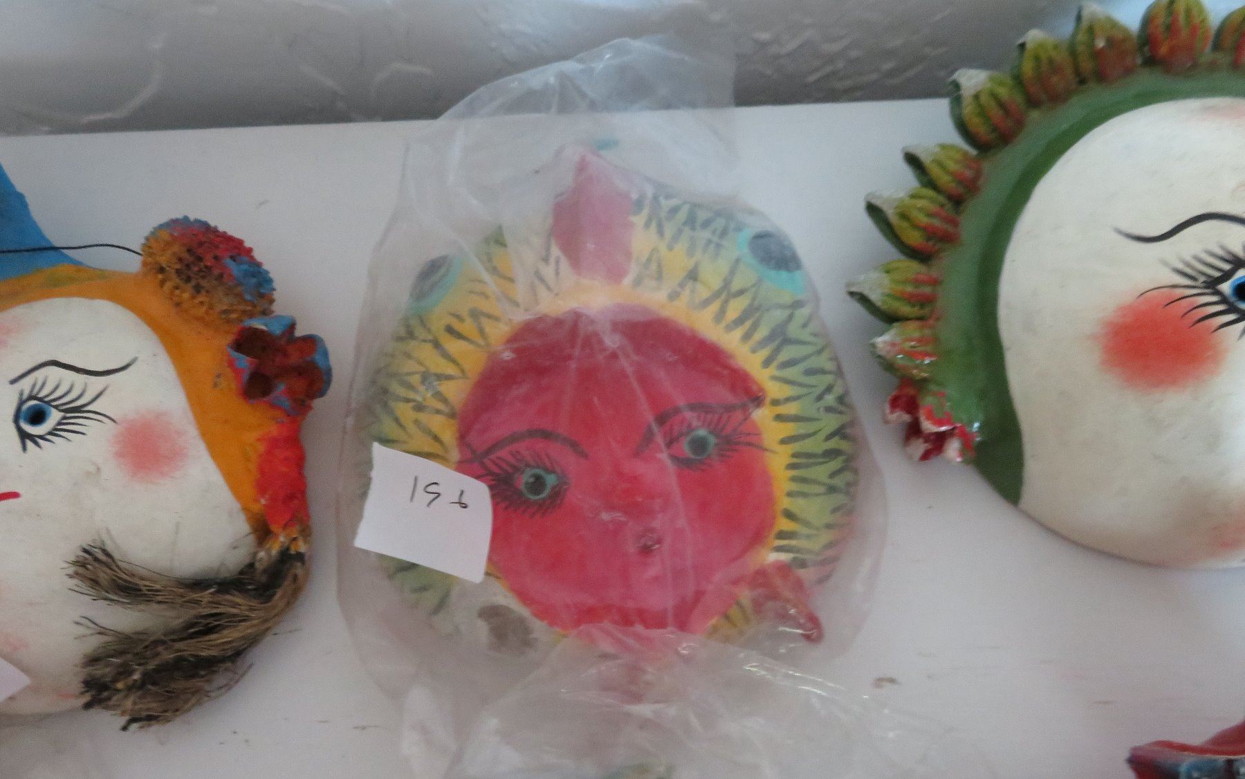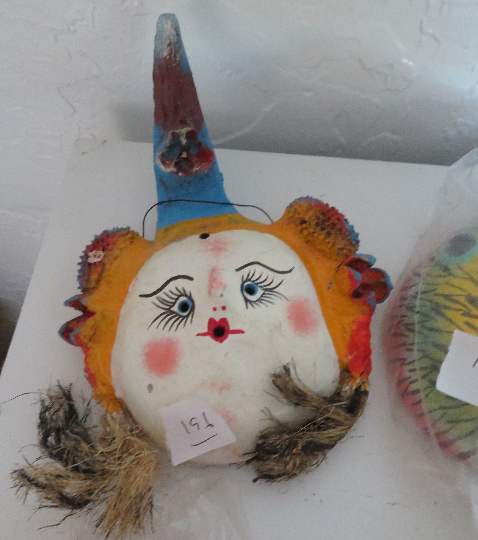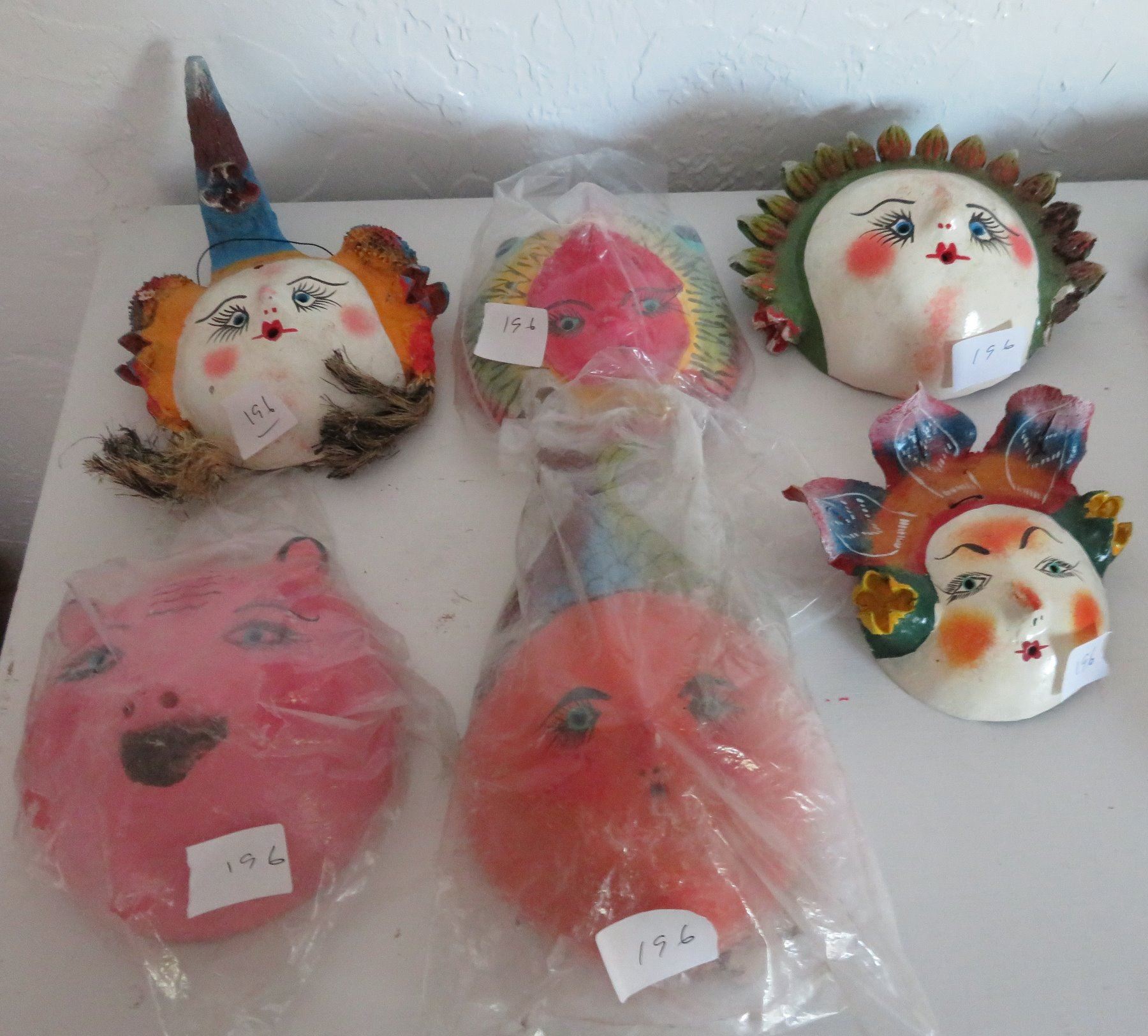 Mexican Mask Collection, c. 1940s. Made of coconut shell and paint, the largest measures 8" x 4". Nice colors, nice paint. Condition: Some scuffs, see images. Shipping: $35.00 w/insurance and signature, double-boxed, due to value and fragility.