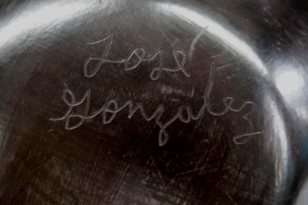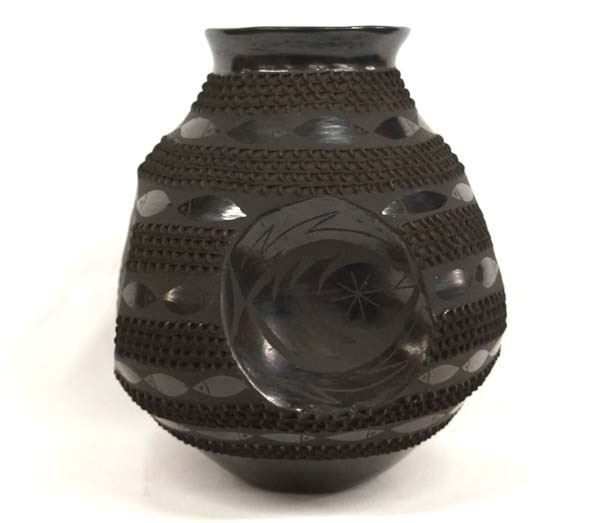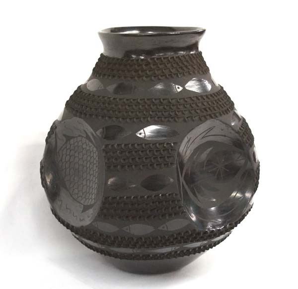 Mexican Mata Ortiz Black on Black Fish Jar by Jose Gonzalez, textured areas, measures 9''H x 8.5''D, signed by artist, gun metal finish