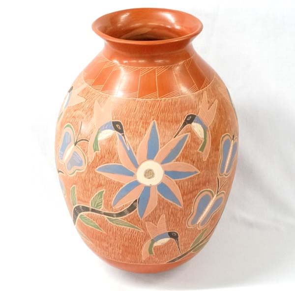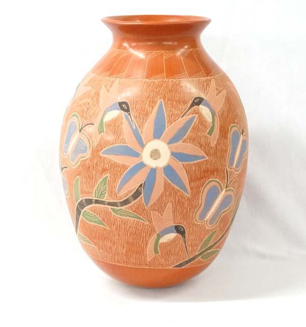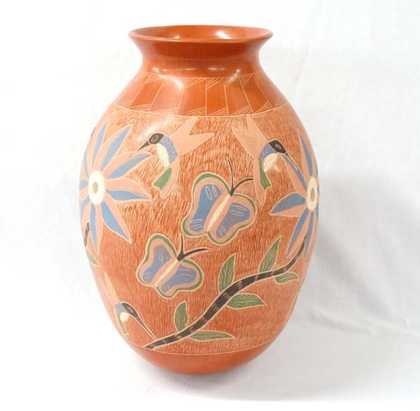 Mexican Mata Ortiz Sgraffito Hummingbird & Butterfly Jar by Karen Camacho, measures 14''H x 9.5''D, signed by artist, stylized feathers around neck, flared rim