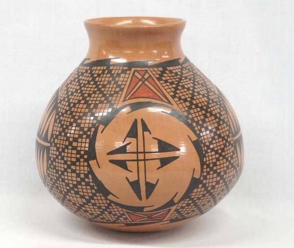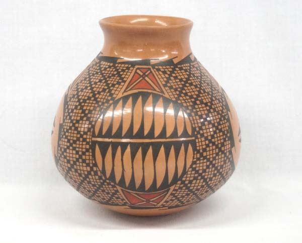 Mexican Mata Ortiz Polychrome Jar by Luis Ortiz, measures 6'' x 6'', signed by artist, features eye dazzler designs and flared rim