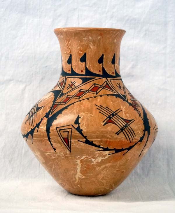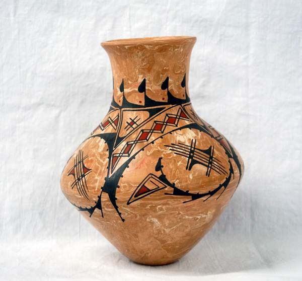 Mexican Mata Ortiz Polychrome Pulled Spout Jar, measures 6.5'' x 6'', features Paquime' inspired lines and designs