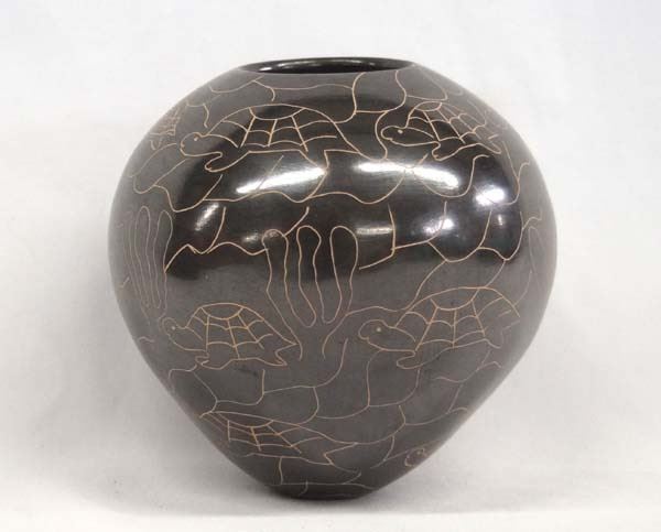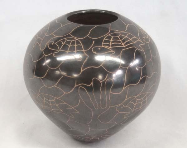 Mexican Mata Ortiz Sgraffito Turtle Seed Jar by Tito Tena, measures 6'' x 6'' and signed by artist