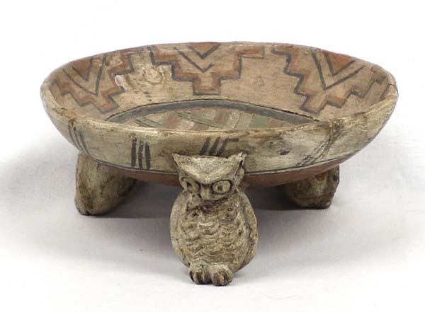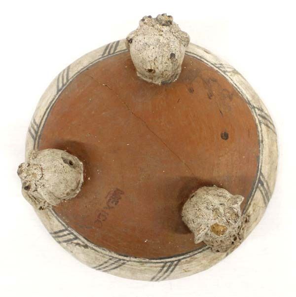 Mexican Mayan Style Pottery Tripod Bowl, measures 3'' x 7.5'', the legs on this bowl are owls, rim has been glued, there is also a chip in the rim, Mexico stamped on the bottom