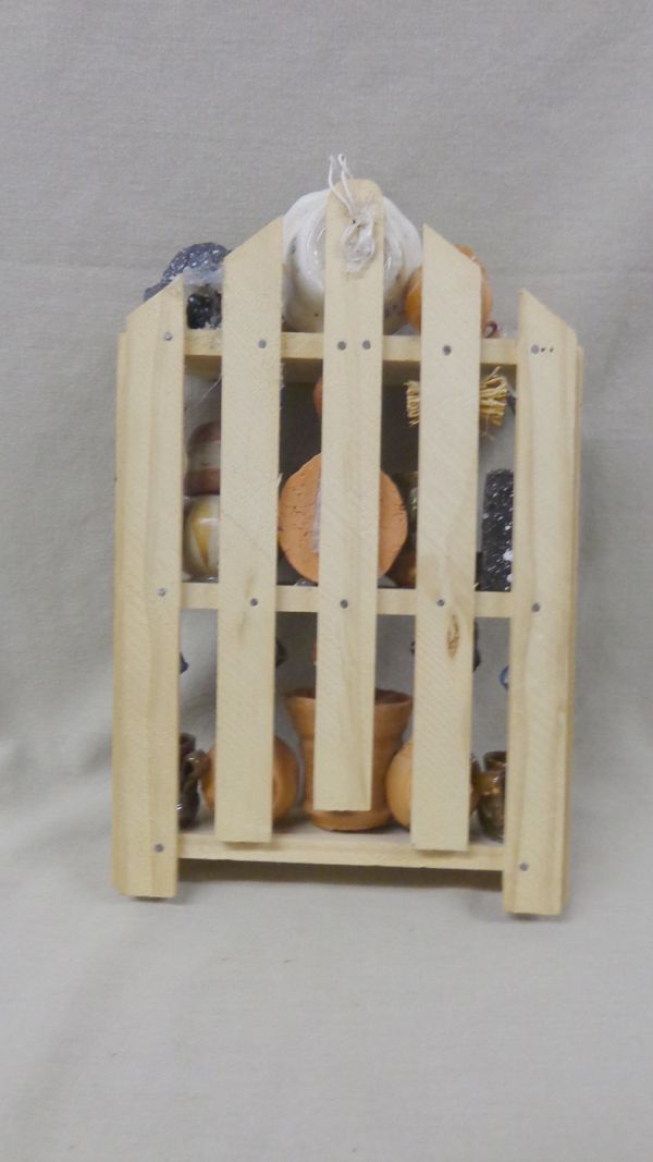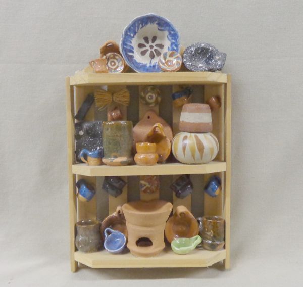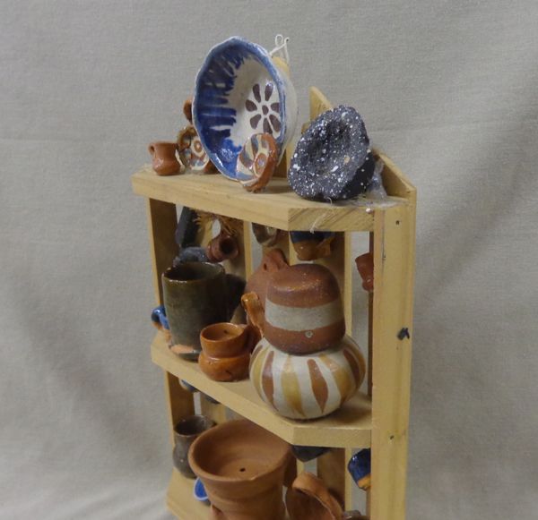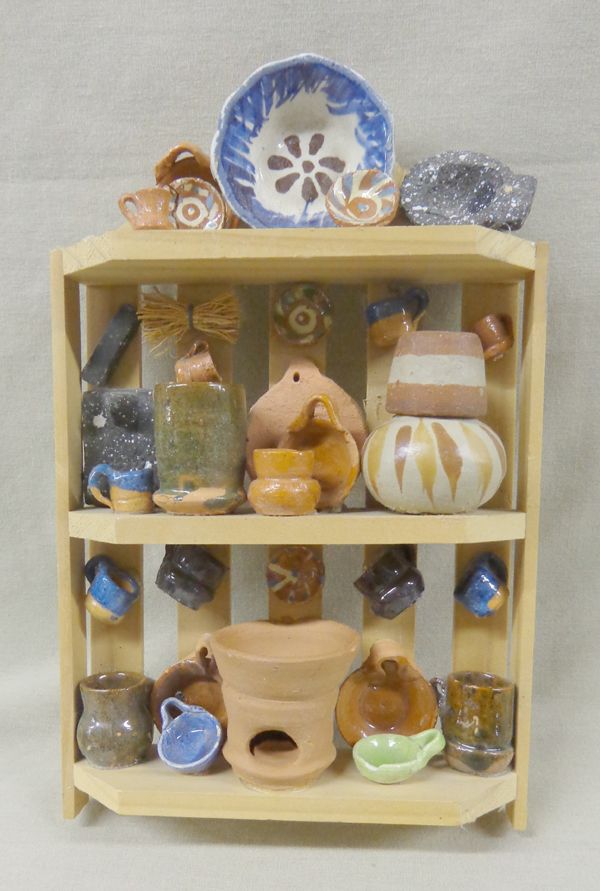 Mexican Miniature Pottery and Shelf. This sweet item measures approx. 10''H x 2''W x 6.5''L