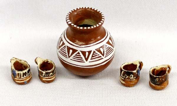 Mexican Miniature Redware Olla and 4 Cups, largest measures 1.5'' x 1'', beautifully hand painted, olla signed Jimon'