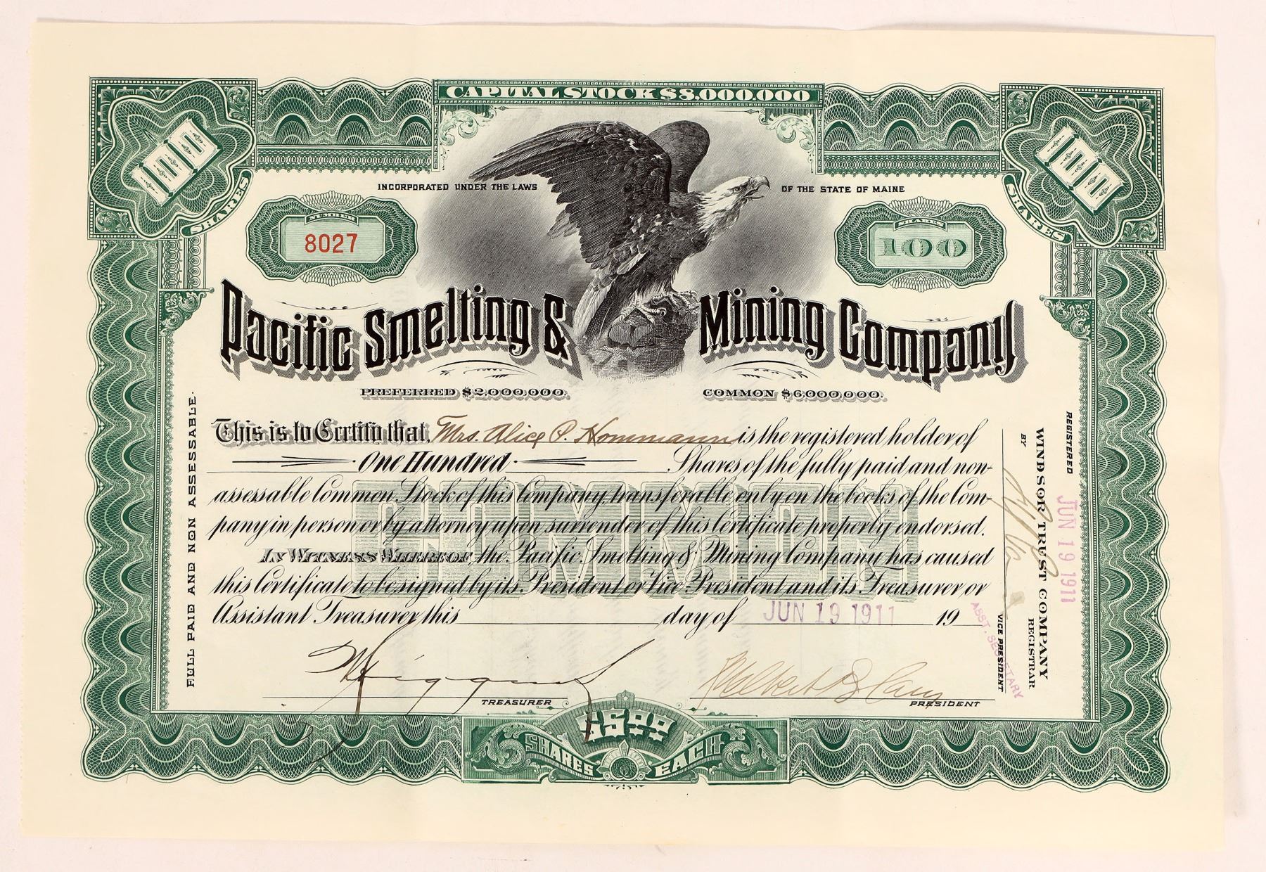 Issued 1911 Pacific Mining & Smelting stock.